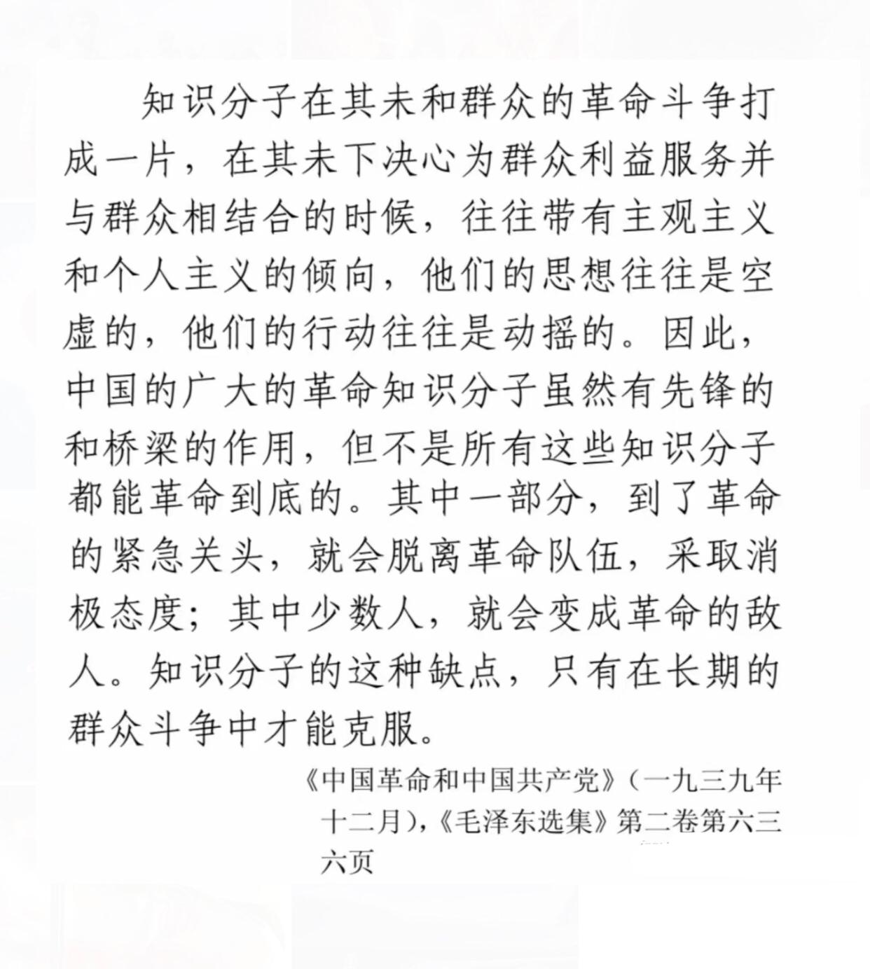如何看待文人和艺人? 看教员亲笔! 知识分子在其未和群众的革命斗争打成一片,在其未下决心为群众利益服务并与群众相结合的时候,往往带有主观主义和个人主义的倾向,他们的思想往往是空虚的,他们的行动往往是动摇的。因此,中国的广大的革命知识分子虽然有先锋的和桥梁的作用,但不是所有这些知识分子都能革命到底的。其中一部分,到了革命的紧急关头,就会脱离革命队伍,采取消极态度;其中少数人,就会变成革命的敌人。知识分子的这种缺点,只有在长期的群众斗争中才能克服。 【说明】:这里说的知识分子主要针对的是专业非常软的文人和艺人,不包括必须通过拼硬核成果来彰显实力的广大科技工作者。 教员在《毛选》第二卷中曾极其深刻的讨论过如何正确认识文人和艺人问题。现在看仍有巨大实践指导意义。