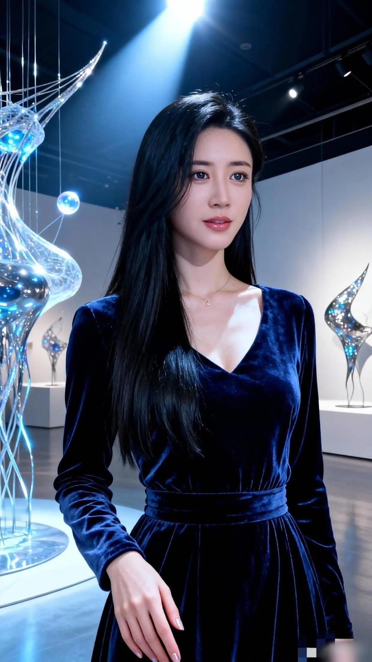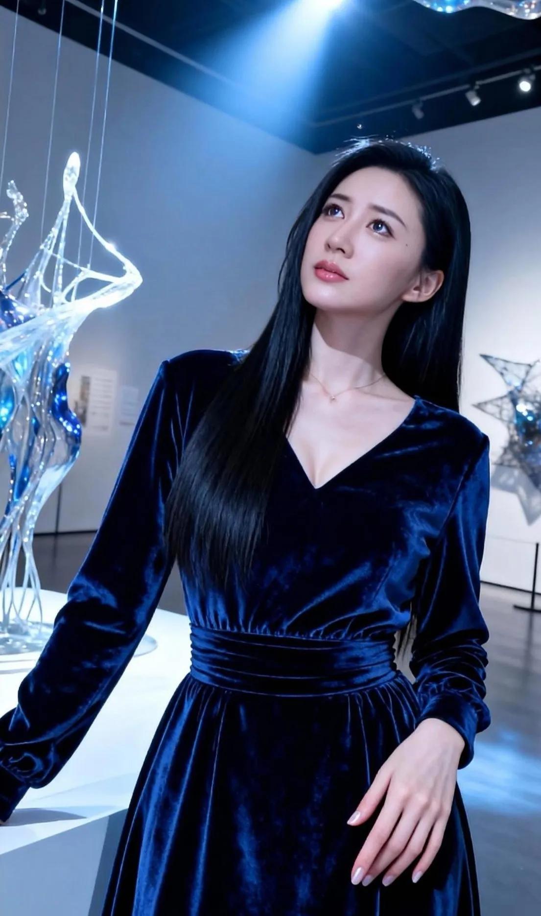 优雅蓝丝绒裙,艺术展上的迷人瞬间