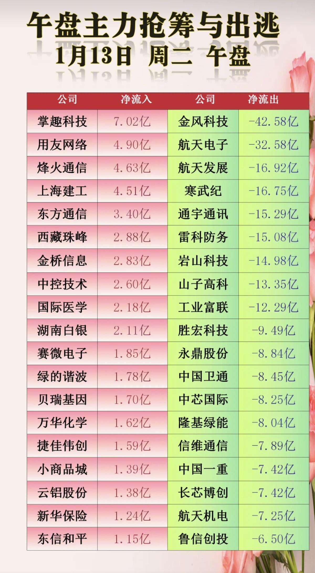 1.13周二 主力大资金 抢筹出逃个股榜 资金抢筹:医药板块,基因测序,医疗器械,多模态AI,智谱AI,互联网服务,油气油服等。 资金出逃:商业航天资金大幅出逃,军工板块,电源设备,风电设备,量子科技,CPO共封装光学,光刻胶半导体等回调出逃