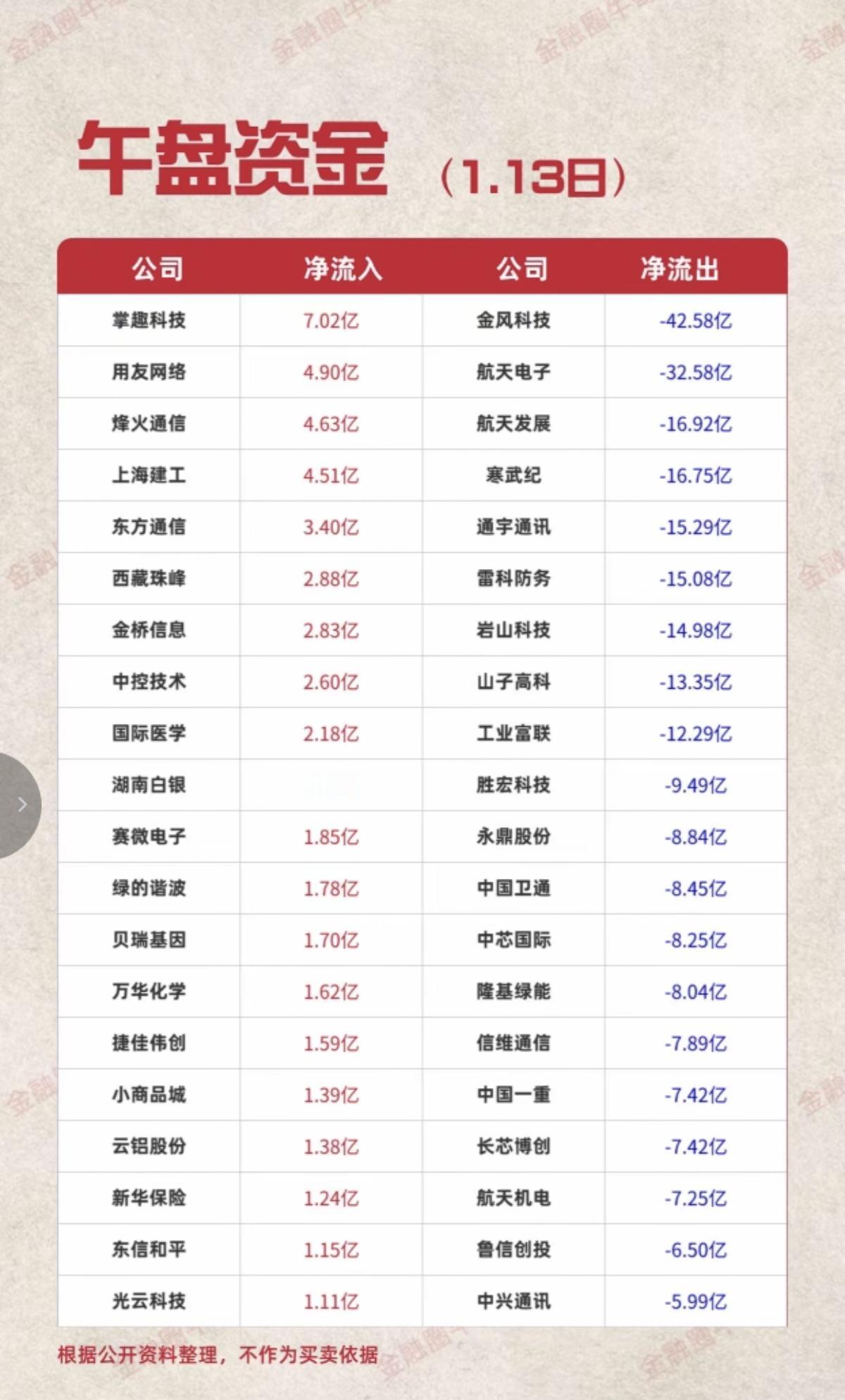 1.13周二 主力大资金 抢筹出逃个股榜! 资金流入: 化学制药,中药,医疗服务相关,黄金白银,医美,银行,软件服务,能源金属,转基因,网红经济等,资金流入明显 资金流出: 军工装备,汽车芯片,通信设备。无人驾驶,消费电子,存储芯片等板块资金流出