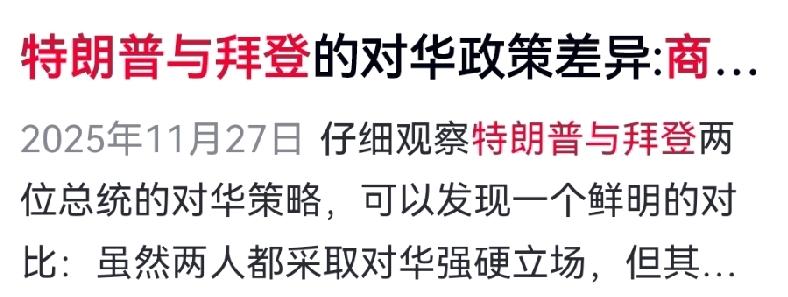 怎么看特朗普和拜登对中国采取遏制政策? 其一,①特朗普和拜登对中国都不手软,遏制是核心,但路子大不同。特朗普是商人思维,算利益账,手段直接,像关税施压,节奏快动静大,政策说变就变,全球市场都跟着颤。2020年中美签第一阶段经贸协议就是例子,中国满足农产品采购等要求,他就降关税,本质拿政策换短期利益。 ②拜登是政客布局,盯着长期战略压制。嘴上说管控分歧,实际压力不减,拉盟友搞多边联动封锁,技术封锁是重头戏,尤其半导体领域,还逼盟友跟进,切断中国供应链绕开可能,在台湾问题上也搞小动作。 其二,两人动机手段差别大,拜登靠多边和技术封锁,压迫感持续;特朗普靠单线关税战,要利益交换。不管哪种对抗,普通人都是受害者,物价、就业、供应链难稳定,对抗不停,压力就在,本质上难有赢家。 其三,历史经验表明,将经贸关系过度政治化无助于问题的解决。中美作为世界上最大的两个经济体,其关系的健康发展需要更多的务实态度和更少的意识形态干扰。在这个意义上,特朗普式的利益导向或许更能为中美关系找到出路。 对此你怎么看?