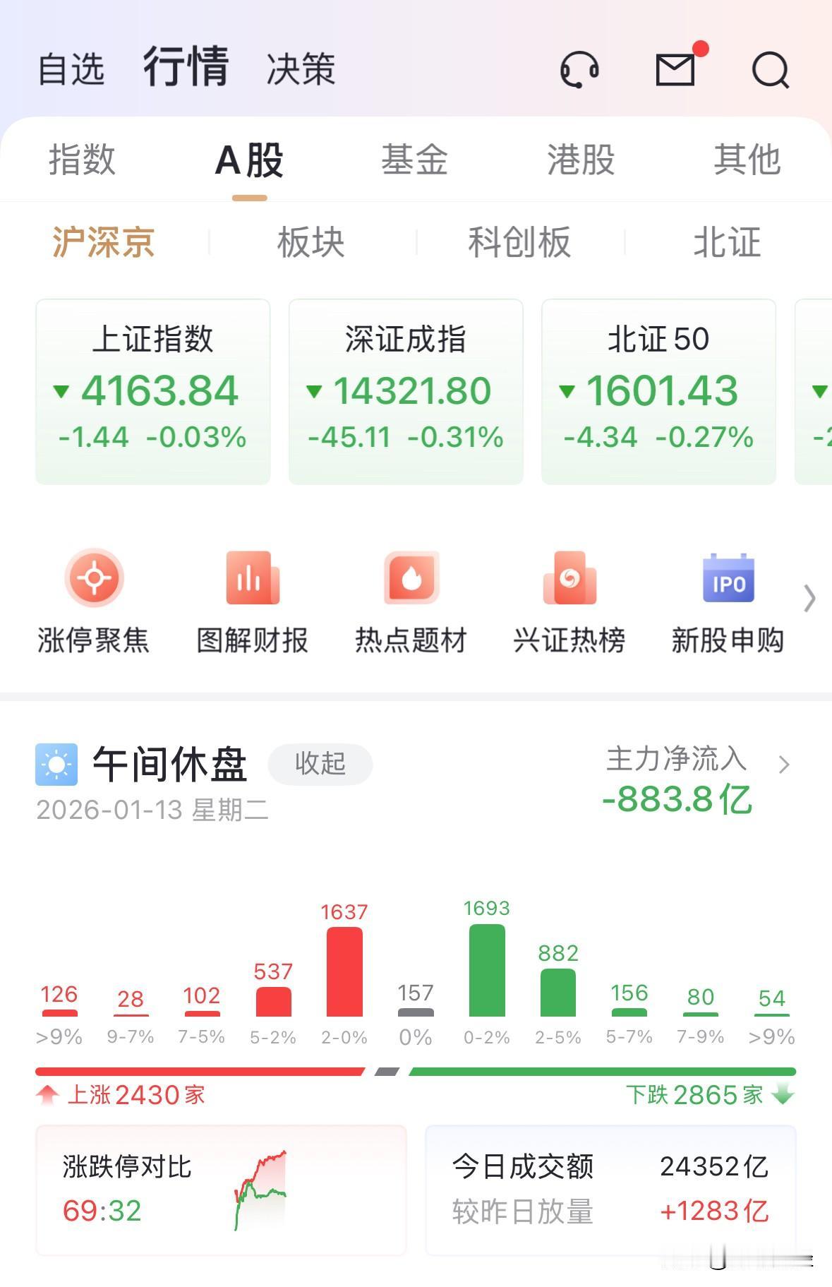 即将开启4.0万亿元的A股纪元? 周二一个早盘成交就达2.43万亿元,同比增幅1283亿元,估计全天将达3.8万亿元左右。 走势依然火爆,涨跌比基本持平,A股这是要上日成交额4.0万亿元,开创史无前例的4.0万亿元日成交额的时代吧? 日成交额的持续创新高,无疑令短线投资者纠心,即怕錯过可能加速上涨行情,又怕被随时的回调影响,好不容易到手的浮盈顷刻就还了回去。 在A股不能既要又要。 个股涨多了就减点仓位,7成仓位为妥,适当落袋为安,没有人会觉得是操作水平问题。 择股也要,要根据自己的风险承受能力来选择。 而对于目前依然股价保持在低位运行的老登股而言,未必回调是坏事。 回调之后就大概率迎来来是轮涨。 乐呀财经