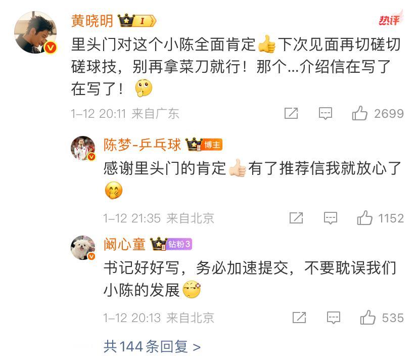 能够让陈梦没想到的事情,一次超级特别体验。黄晓明来互动,特别的肯定! 陈梦社交平台发布动态,参演小城大事,黄晓明留言,里头门对这个小陈全面肯定,下次见面再切磋切磋球技,别再拿菜刀就行!那个…介绍信在写了再写了! 陈梦回复,感谢里头门的肯定 有了推荐信我就放心了! 陈梦实在太优秀了,连续2届奥运冠军,多次参加节目,满满的正能量! 如今,出演小陈,演技也十分到位! 恭喜,陈梦,我要去追剧了。
