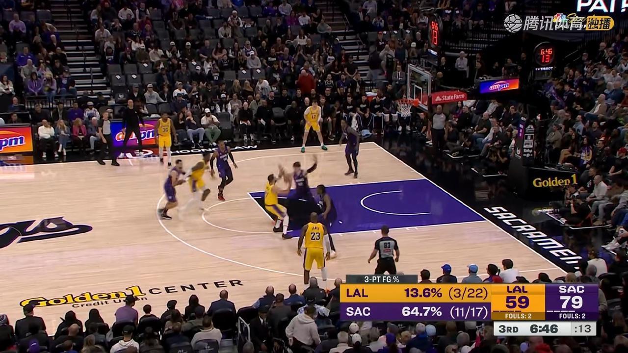 湖人已落后国王20分,这比赛还打吗?詹姆斯三分不中,威少回来追身三分,高下立判。 湖人是想打破玄学吗?争取让四大流量队都进入附加赛区,湖人、火箭、勇士、快船。 比分又缩小了,第三节还有5分钟,湖人69-84落后国王15分,国王叫暂停。这场面真是太难看了,一点强度都没有,防守全在看戏。