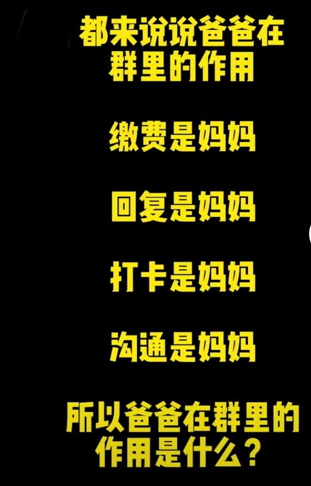 今天看到一个视频: 缴费的是妈妈,打卡的是妈妈,沟通的是妈妈,所以爸爸在群里的作用是什么。评论区很多人都说是父亲不负责任,存在感低。。 我们就在那里讨论,办公室的王姐说父亲的爱一点都不少,只是他们不善于表达。她年轻那会儿,家里装的有线电话,客厅卧室都有分机,每次她给家里打电话都是找她妈妈接听,有事也都是和她妈讲,有一次她有事情找她爸爸,她母亲才在电话里说,他爸在卧室的分机听着呢,每次她打电话她爸爸都默默的听着她们母女二人说话,从不插话,就是想听听女儿的声音。 个人也觉得其实没必要搞男女对立,人和人的性格本身就存在差异,表达的方式和擅长的东西本就有区别,没必要非要做比较,友友们怎么看,评论区讨论下吧。