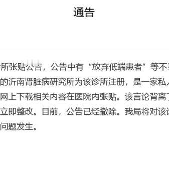 这几天,山东沂南县一家私人诊所贴出的"放弃低端患者"公告,直接把"医患矛盾"这层窗户纸捅破了。76岁的诊所负责人王某学,因为受不了少数患者"花一块钱想换一千块服务"的态度,从网上抄了段犀利文字贴墙上,结果引发轩然大波。 公告里写着:"低端患者花1块钱要10块钱的药,100块的效果,还得要1000块的服务!"而"优质患者从不讨价还价,只要真本事解决问题,心甘情愿买单"。这话虽然扎心,却折射出部分基层医疗机构的无奈——王某学后来坦言,有些患者不仅不配合治疗,还故意刁难,"开诊所不能爱心泛滥"。 但医疗毕竟不是买卖。沂南县卫健局迅速介入,指出这类言论严重背离医德要求,对王某学约谈批评并责令整改。目前公告已撤下,官方承诺将加强全县医疗机构监管。 这件事最让人深思的是:当"性价比"思维撞上医疗的公益性,医患之间该如何重建信任?或许双方都该想想——患者要理解诊所的运营成本,医生也需牢记"医者仁心"不是口号,而是底线。山东诊所 开诊所手续 小诊所乱用药 山东开诊所 医院诊所备案