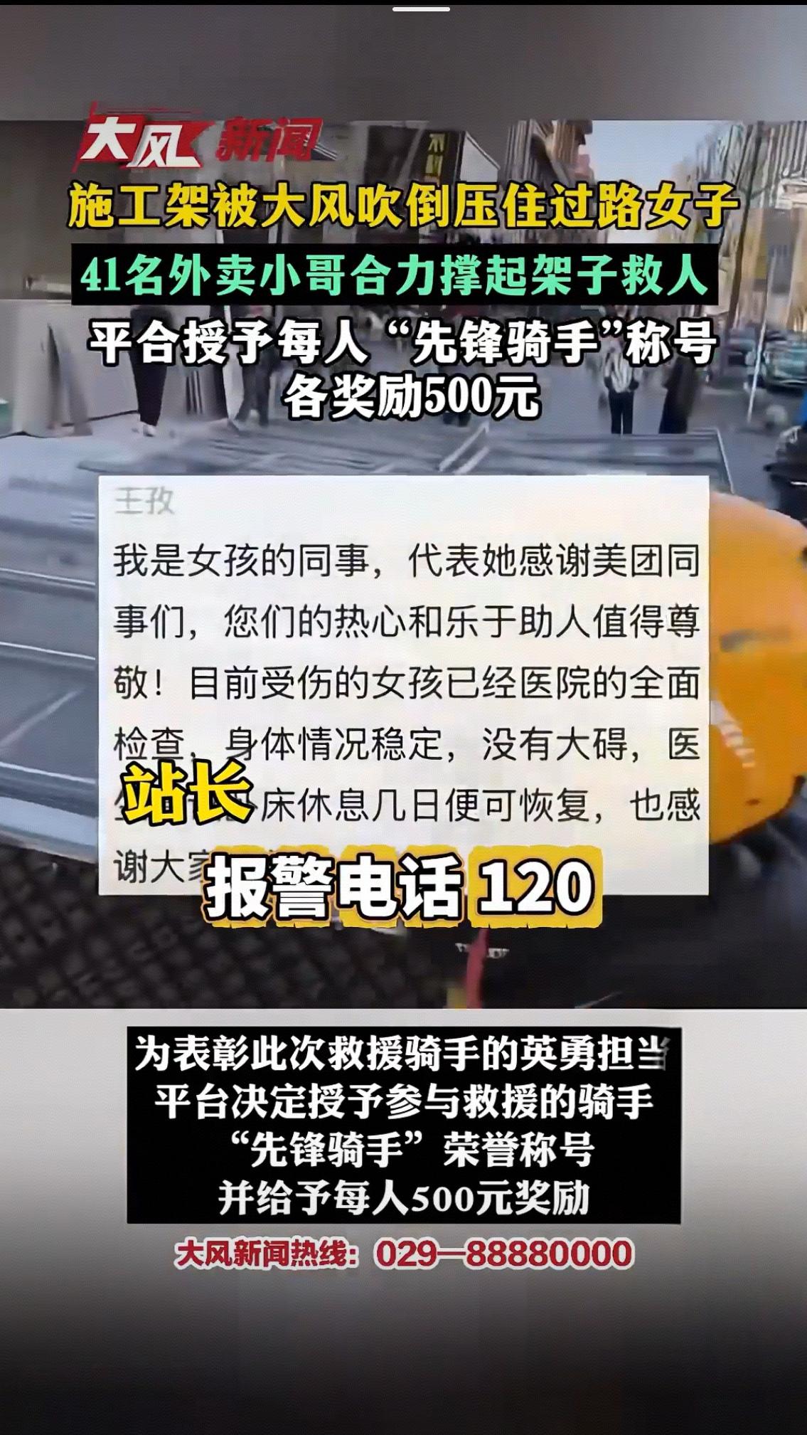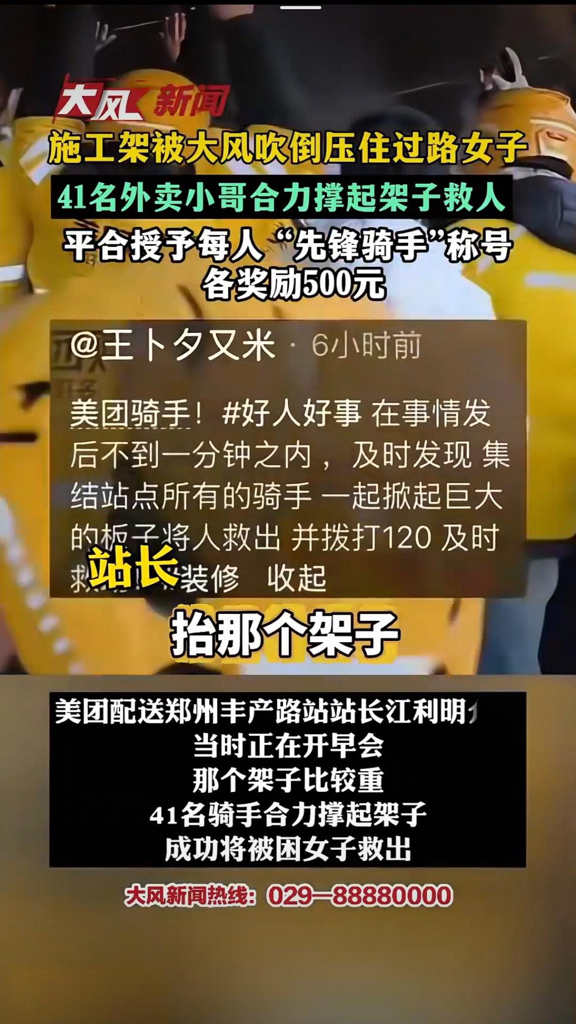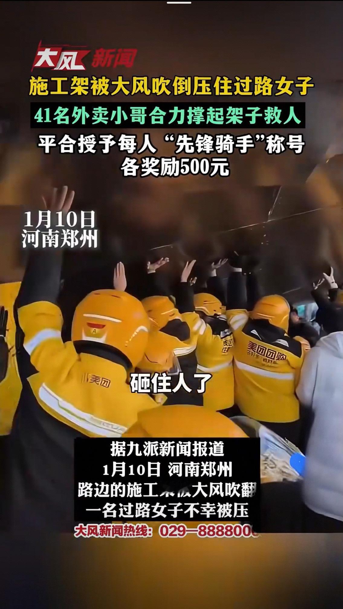 1月10日的郑州,大风裹挟着寒意席卷街头,一声“哐当”巨响打破了清晨的宁静——路边施工架被狂风掀翻,数吨重的钢管与挡板瞬间坍塌,一名过路女子躲闪不及,被死死压在底下,尖锐的呼救声在呼啸的风声中格外揪心。此时,不远处美团丰产路配送站的41名骑手正在开早会,刚听完站长强调配送规范的他们,听到“砸住人了”的呼喊,没有一秒犹豫,齐刷刷丢下头盔餐箱,黄色的骑手服在风中汇成一股暖流,直奔事故现场。 “当时脑子里就一个念头:赶紧救人!”参与救援的骑手张哲回忆,坍塌的施工架由粗重钢管搭建,单靠一人之力根本无法撼动,且随意撬动可能造成二次伤害,残余架体还在风中微微晃动。站长江利明当机立断:“找好支点一起发力!”41名骑手立刻自发分工,有人牢牢托住架体边缘稳住重心,有人俯身寻找受力支点,有人紧盯架体动静预警风险,还有人第一时间拨通120。“一、二、起!”整齐的号子声穿透风声,41双布满薄茧的手紧紧攥住冰冷钢管,手臂青筋暴起,寒风中汗水顺着额头滑落,粗糙的钢管将掌心硌出红印,甚至有人被尖锐管头划破皮肤,却没有一人松手退缩。 两名身形瘦小的骑手小心翼翼钻到架下,一边轻声安抚“别怕,我们带你出去”,一边缓慢清理缠绕在女子身上的杂物,轻柔地将她从钢架缝隙中移出。从火速集结到成功救人,全程仅用十几分钟,没有专业救援装备,只有一颗颗滚烫的善心撑起了生命通道。女子被救出后,骑手们围上前护住她,直到120救护车赶到,又帮忙抬上车反复叮嘱医护人员,才默默拍掉身上的灰尘与铁锈,捡起散落的餐箱——有人顾不上检查救援时碰坏的车辆,有人手机里还响着订单超时的提醒,仿佛这场惊心动魄的救援只是日常里一次微不足道的驻足。 当目击者将这一幕上传网络,郑州41名外卖员徒手抬架救人 话题火速冲上热搜,网友们纷纷破防:“平时风里来雨里去送外卖,危急时刻变身超级英雄”“41双手撑起的是一座城的温暖”“这才是刻在骨子里的仗义”。而平台的回应更让这份善意有了温暖回响:授予41名骑手“先锋骑手”称号,每人发放500元现金奖励,并对受损车辆全额补偿。面对镜头,骑手白筝鸣腼腆地说:“当时真没想那么多,就是出于本能,没想到能得到这么多关注”。 这500元奖金,或许不及他们跑几单外卖的收入,却承载着对平凡英雄的最高敬意。事实上,外卖骑手群体的暖心善举从未间断:昆明骑手雨夜勇救受伤路人,湖北骑手徒手爬上顶棚救下坠落男童,山东骑手冒险扑救自燃车辆……他们常年穿梭在城市街巷,与时间赛跑、为生活奔波,却始终怀揣着最朴素的善良。有人说他们是“被算法裹挟的奔跑者”,但这些瞬间告诉我们,他们更是城市里最温暖的“流动哨兵”,是危难时刻最可靠的“生命支架”。 在这个容易被功利与冷漠裹挟的时代,41名外卖小哥用行动诠释了:见义勇为从不是惊天动地的壮举,而是危难时刻的本能选择;英雄从不在聚光灯下,而在你我身边。当越来越多平凡人愿意为陌生人伸出援手,当善意能够得到及时的肯定与回馈,这座城市便会充满向上的力量。你被这群黄衣小哥的举动暖到了吗?你身边有没有这样的平凡英雄?欢迎在评论区分享你的故事与感受美团外卖 !河南郑州起风了