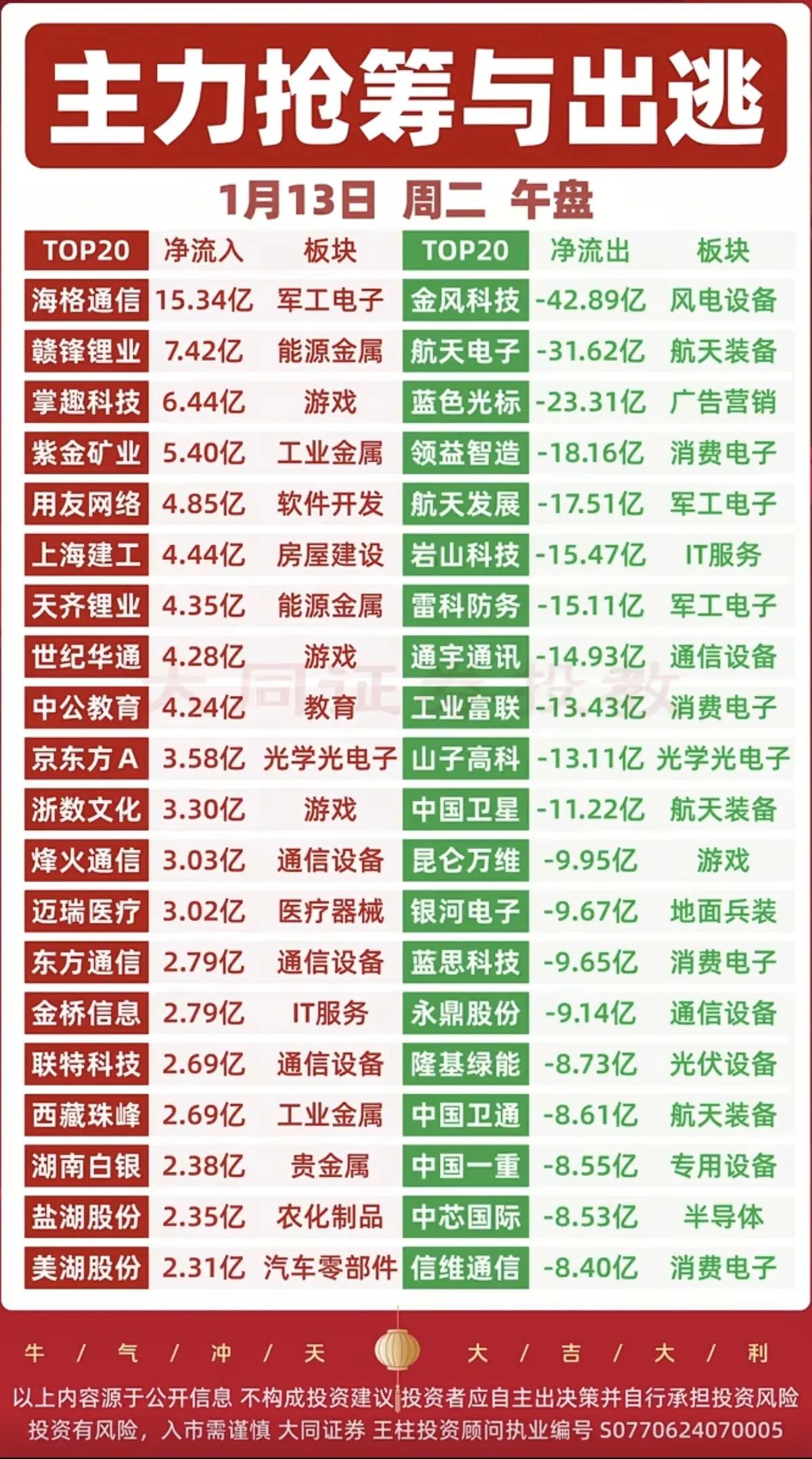 1月13日,周二A股主力抢筹出逃一览表!!! 海格通信主力资金大幅流入15.34亿,后市值得期待;掌趣科技主力资金大幅流入6.44亿,后市值得重点关注;金风科技主力资金大幅流出42.89亿,后市需小心谨慎;航天电子主力资金流出31.62亿,商业航天板块调整,后市注意风险!!!