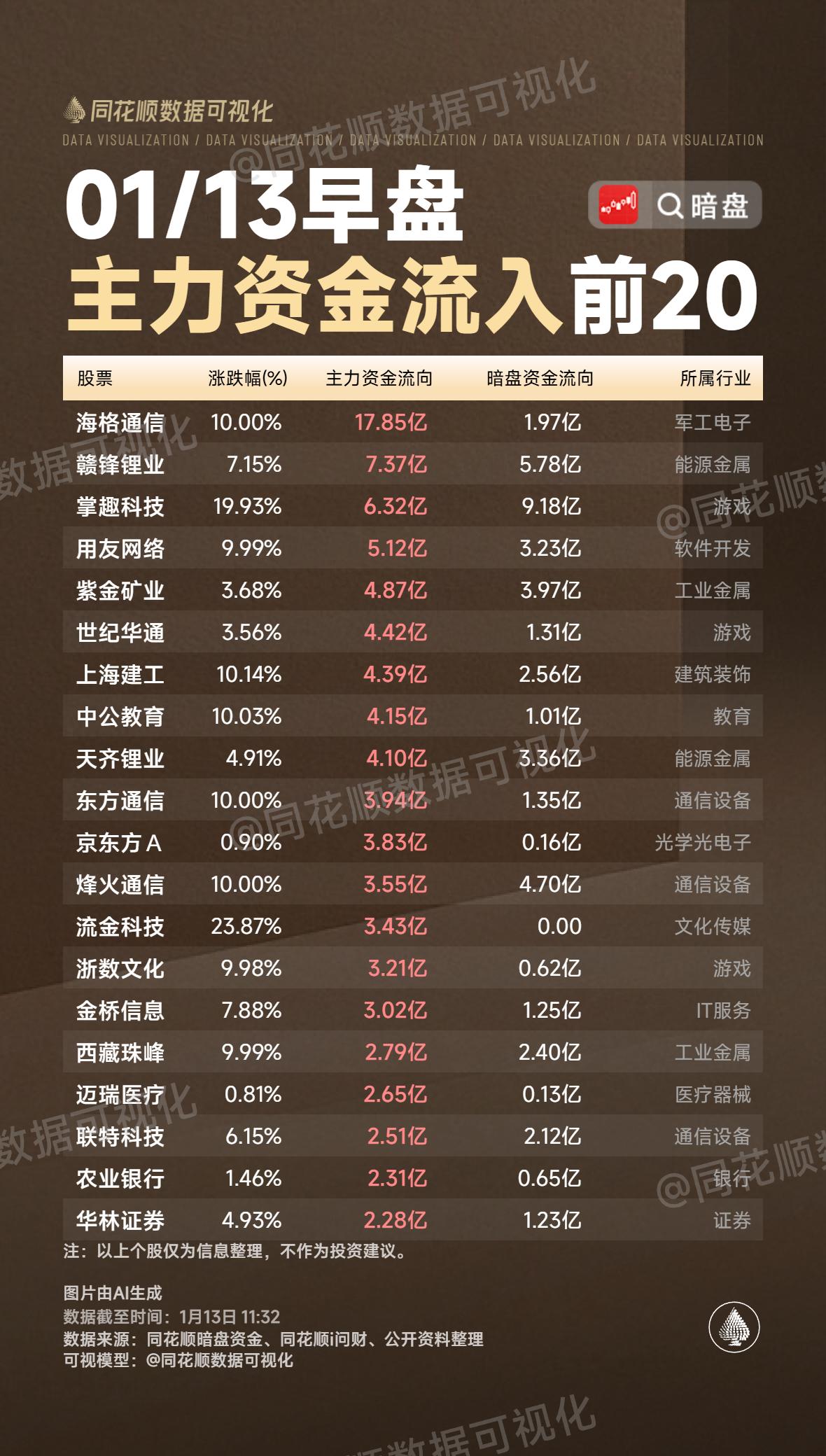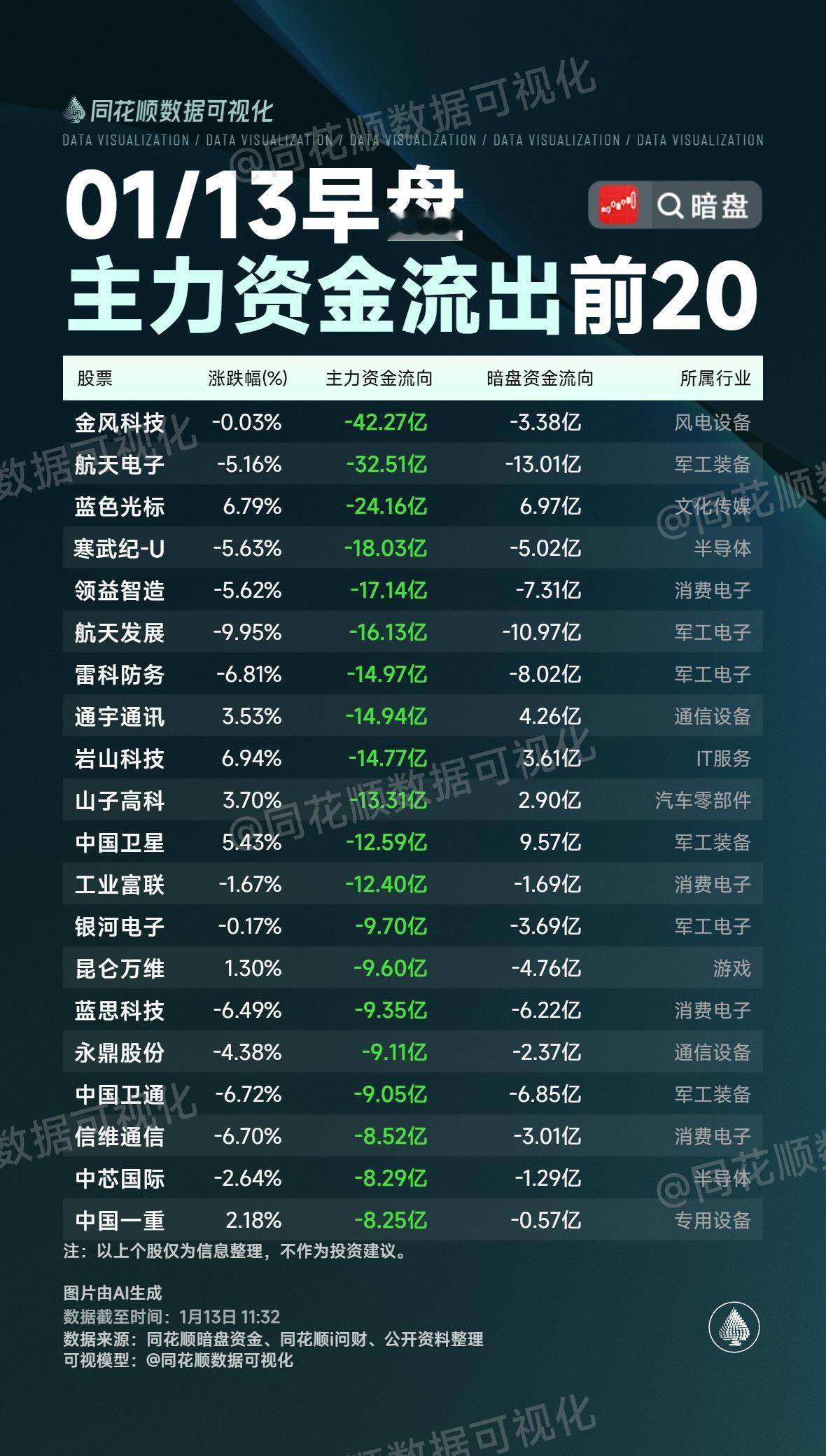 1月13日,周二A股主力资金流入流出一览表!!! 海格通信主力资金大幅流入17.85亿,暗盘主力资金买入1.97亿,后市值得高看一眼;赣锋锂业主力资金大幅流入7.37亿,暗盘资金流入5.78亿,后市值得期待;金风科技主力资金大幅流出42.27亿,暗盘资金流出3.38亿,后市需小心谨慎操作!!!