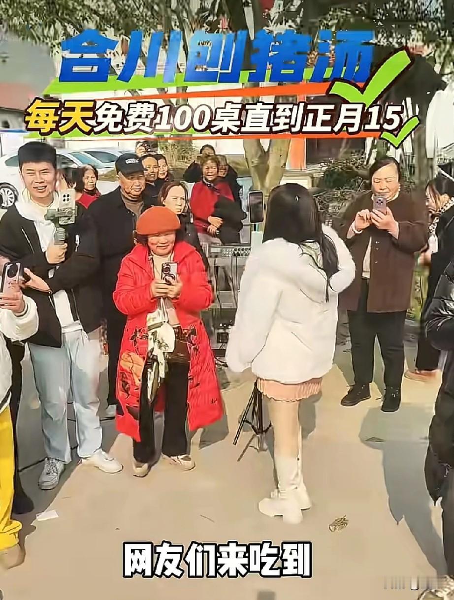 合川老板放大招!为接呆呆妹儿流量,刨猪汤每天100桌免费吃到正月十五。 谁能想到,呆呆妹儿的一个视频,竟然让合川的刨猪汤直接火出了圈! 最近合川这位老板的操作,属实把网友看呆了——为了承接呆呆妹儿带来的流量,老板当场承诺,刨猪汤每天免费摆100桌,一直连续供应到正月十五! 从视频里能看到,现场已经聚满了前来打卡的游客和网友,大家围坐在桌前,热热闹闹地喝着刨猪汤,氛围直接拉满。老板一边忙着招呼客人,一边笑着兑现承诺,这波大气的操作,也让网友直呼“合川这波流量密码算是玩明白了”! 有人调侃“呆呆妹儿这‘祸’闯得,直接让合川的刨猪汤成了网红打卡项”,也有本地网友骄傲表示“我们合川的热情,就是这么实在”。 不过现在的网友中,没素质的人还是存在,视频中,我们也看到不少现象:有人穿得人模狗样却乱扔垃圾,而有人却不辞辛苦地拧着袋子收拾垃圾。 这就不得不说一句:素质这个词,有些人还真的配不上。 不知道有没有小伙伴打算去合川尝尝这免费的刨猪汤?评论区说说你对这波操作的看法~ 带定位晒今日生活重庆 刨猪汤 呆呆妹 我的今日状态:😁轻松愉快 我这里的天气:☀️晴天