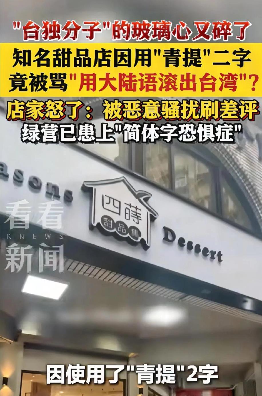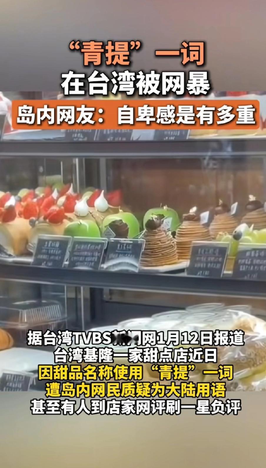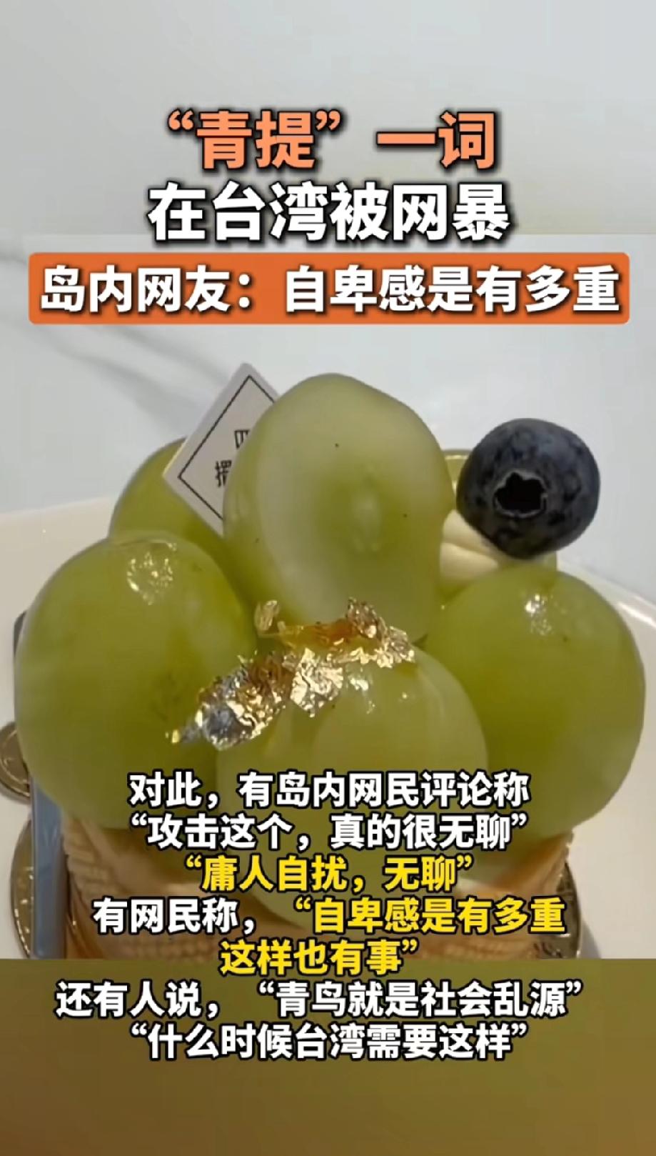 青提不就是个葡萄名吗?!玻璃心又碎了?吃个东西都扯地域,闲得慌? 台湾基隆一家甜品店用“青提”命名甜品,被岛内部分网民质疑说是大陆用语,还遭人刷差评,私信骚扰,商家回应是因好念才取的! 吃个甜品而已,管叫啥名字呢?!两岸同胞一家亲,语言文字、生活习惯本来就有很多相通的地方,不叫青提叫什么呢?绿葡萄?!连大陆的常用叫法都上纲上线,挺让人无语的!