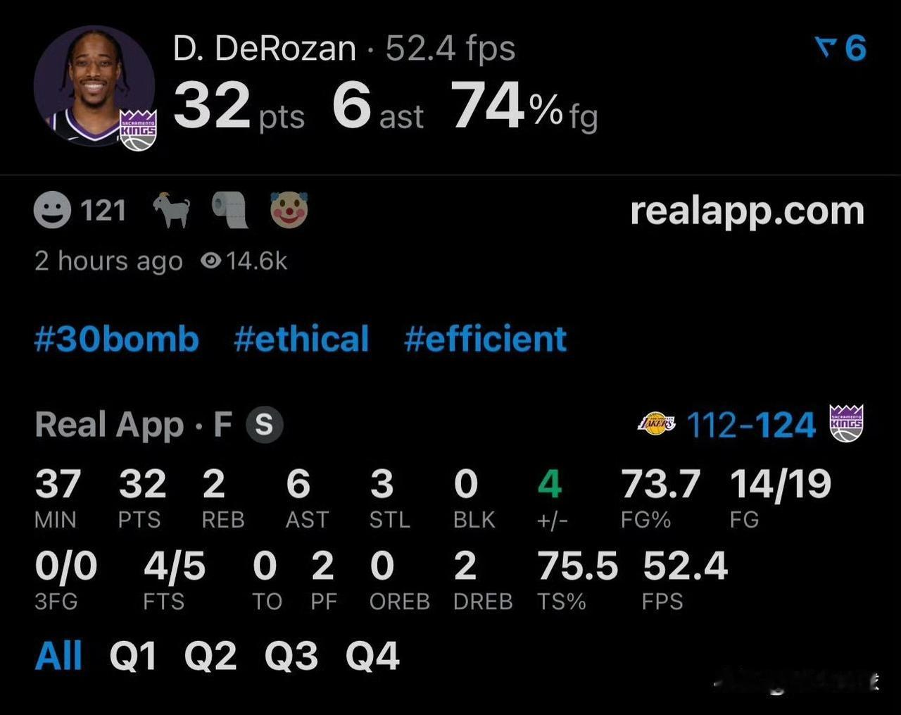 德罗赞不愧是现役“中距离的神”! 今天,主场作战的国王队以124-112大胜湖