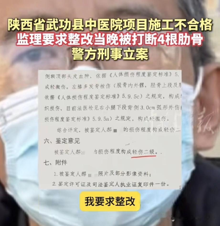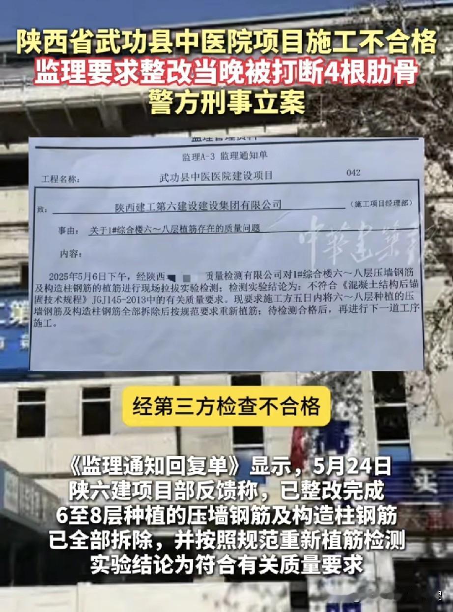 陕西一工地总监被打断四根肋骨,他得罪了谁? 刚刷到在陕西建工第六建设集团有限公司承建的武功县中医医院建设项目,一总监理工程师晚上在工地被三位不明身份人员群殴了,下手挺狠,一分钟就给打晕了,两个小时后才醒过来。 据了解这位总监是陕西本地人,今年都59了,再干几年就退休了,在这个工地也干两年了,没想到这么大年龄还被人揍了。 白天的时候因为工地现场二次结构植筋拉拔试验不合格,施工单位就私自把墙垒完了。总监巡视发现以后,要求施工单位返工拆除重做。然后晚上就被陌生人在工地上揍了。 陕西建工第六建设集团有限公司不应该啊,国企特级资质建筑企业工地现场就这个管理水平么,这也太差了。这么简单的植筋拉拔试验都不合格,现场技术人员吃干饭的吧。而且陌生人员随便出入工地,把项目监理机构现场负责人总监理工程师都给打医院去了,工地保安、门卫干什么去了。 总监被打这真是施工单位狗急跳墙的表现,有这个本事就把现场质量搞好,植筋拉拔试验经第三方检测合格,别天天干非法行贿、狗急跳墙的龌龊事,搞好工程质量,对自己对社会负责。