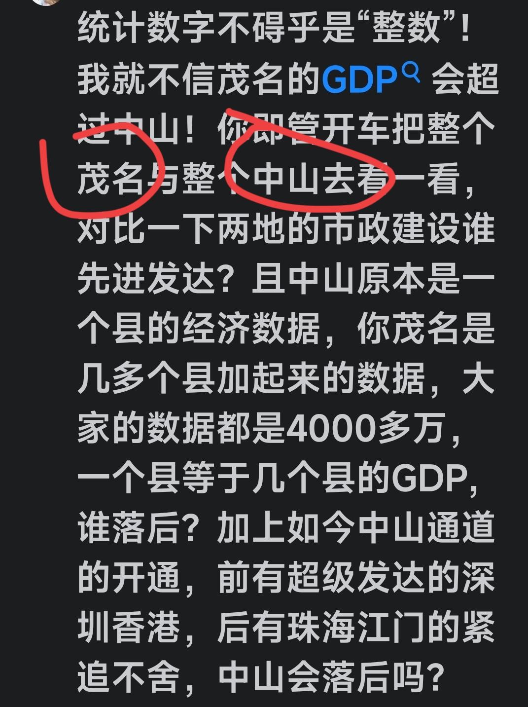 咱茂名真成了广东非珠地区的大明星,为啥呢? 因为广东有不少人都爱拿茂名来作比较。 以往是拿湛江和茂名比,如今更夸张,又拿中山与茂名比! 比些啥呢?比GDP、比财政、比存款、比外流人口、比税收、比光棍数量等等,看谁更胜一筹。 拜托了,茂名一心想努力发展地区经济。 而茂名,不该成为某些人眼中,躺着睡着也中枪的城市!