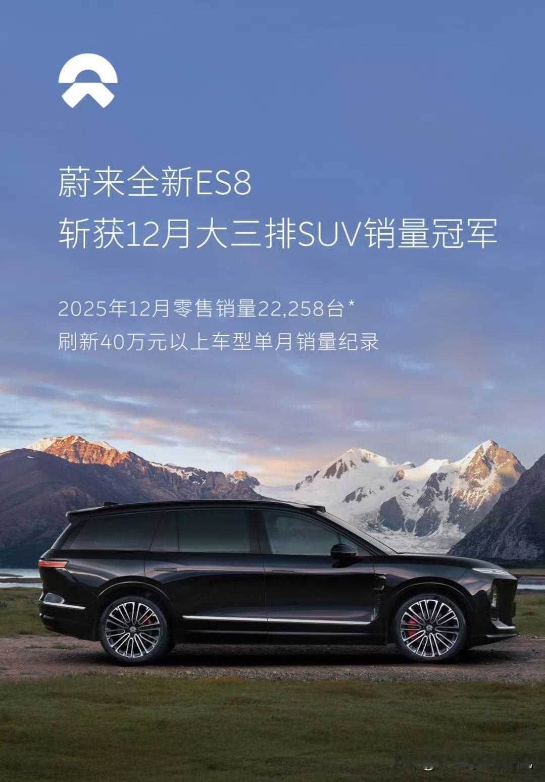 把隔壁理想都羡慕得流口水。 谁能想到,蔚来最后是靠这位“大哥”ES8扛起了销量大旗? 40万以上的售价,12月居然闷声卖了22258台,直接刷新纪录,而且全部是纯电,没有增程。 这下可好,展厅里的“实力派”瞬间变成“走量王”,看来各位老板们年底出手是又猛又准啊!