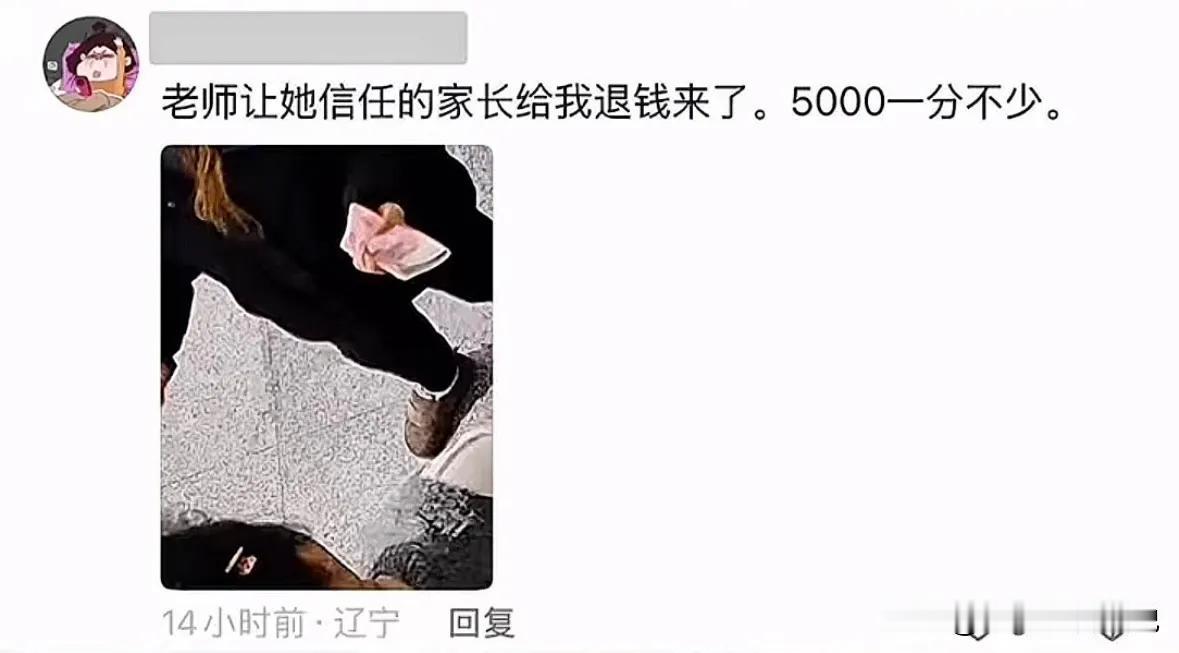 这事儿应该是真的,老师很有自知之明。 沈阳和平区公开征集,凡是发现老师收受家长礼品礼金的,有偿课外补课的,任何人都可以提供线索。 网上流传这么一张截图,说老师把自己送给他的礼金退还了,5000块钱一分不少。 这应该是真的,其实老师对于此事也很明白,他们心里也很有自知之明。 第一,收钱的时候,老师就知道这钱烫手。 这位老师,对于相关的规定是非常熟悉的。 在这种情况下,接纳家长来送的礼品,老师可能心里面有苦衷,但是也知道这钱烫手。 否则的话,也不会在教育局发出相关的文件后第一时间就归还。 第二,收钱的时候,老师应该已经做好了记录。 老师毕竟是一个文化人,哪些家长送礼了,送了多少钱,老师心里应该有一本账。 谁的家长,什么时候,在哪里?送了多少钱?在这个专门当中应该记录的非常清楚。 否则的话也不至于,这个家长所说的5000块钱一分不少。 不知道时间过了多久,但是从5000块钱一分不少,而且还能精准送达指定的人,说明老师是做了详细的记录的。 这件事说到底真像是一个闹剧。 家长不该给老师送礼,老师更不应该收受礼品。 所有人都应该奔着,让孩子的成绩越来越好,这个目标努力向前 每个人都做好自己该做的,都付好自己该负的责任,就可以了,不要搞那些弯弯绕!