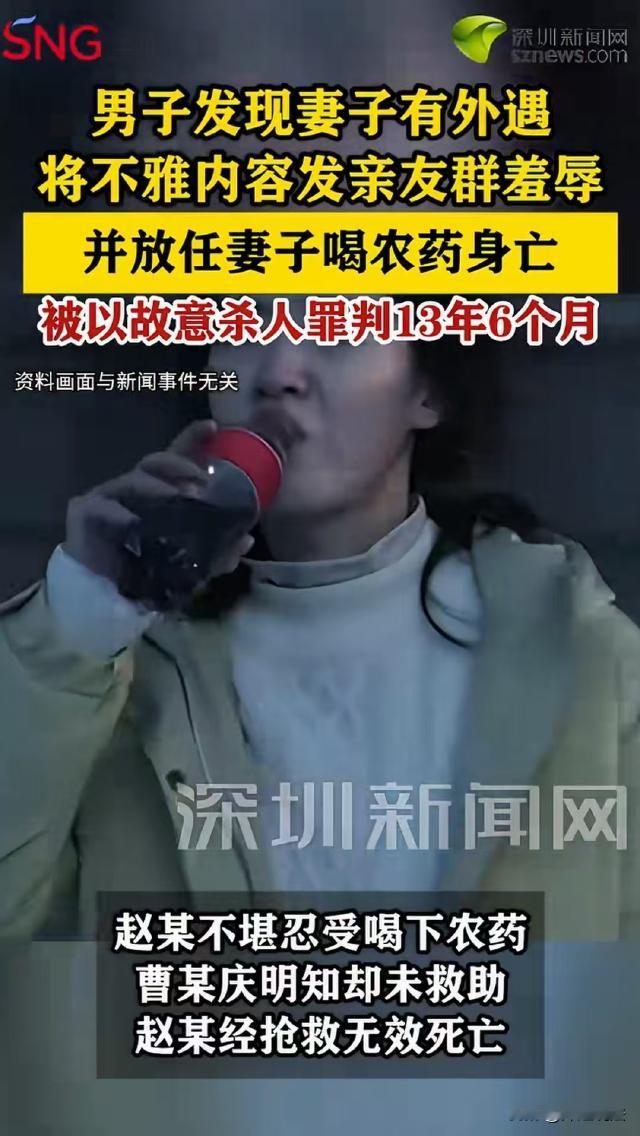 山西,男子发现妻子手机里有和他人的不雅聊天记录,顿时气得打了妻子一顿,打完后不解气,男子又将聊天记录发到妻子的亲属群里,并艾特丈母娘和妻妹,要求她们给自己一个说法。妻子羞愤交加,喝了一瓶敌草快,男子冷眼旁边,直到几个小时后,妻子的亲属发现她喝了药,才将她送去救治,可为时已晚。案发后,男子因故意杀 认罪获刑13年半,男子不服起诉。 据、深圳新闻网报道,2022年7月2日傍晚五点左右,曹某看见妻子赵某笑眯眯地和别人聊天。 曹某心中起疑,趁赵某不备抢走她的手机,赵某立即跳起来抢夺,可她越是这样,曹某心里越是怀疑。 翻看了赵某的聊天记录后,啪的一声脆响,曹某结结实实打了赵某一个耳光。 原来,他竟然在妻子的聊天记录里,看见她和别人搞暧昧,其中甚至有很多不堪入目的内容。 曹某认定赵某背叛了他,可赵某不承认,说自己只是和别人聊天,并没有做出实质性的事情。 曹某哪里肯信?两人吵了起来,曹某愤怒之下,狠狠打了赵某一顿。 曹某仍不解恨,又将赵某和别人的聊天记录发到她的家族群里,还当着群里亲朋好友的面艾特赵某的母亲和妹妹,要求她们出面解决事情。 赵某得知聊天记录被曹某发在了群里,顿时感觉天塌了,她又羞又恼,再次和赵某吵了起来。 赵某却不依不饶,让赵某声誉扫地,赵某羞恼绝望之下,喝下了一瓶敌草快,曹某没有阻止。 赵某喝下后,曹某冷眼旁观,哪怕赵某出现呕吐等中毒现象,曹某也没采取任何救助措施。 直到晚上8点20分左右,赵某的家属发现她喝了药,赶紧将她送去救治,但不幸的是最终不治离世。 案发后,曹某因涉嫌故意伤害罪被检方提起公诉。 2023年6月30日,一审认为,曹某构成故意杀 人罪,判处其有期徒刑13年6个月。 有人说,赵某明明是自己做错了事自 杀,为什么曹某会被判刑?并且,检方明明是以故意伤害罪起诉的,为什么曹某最后却被判故意杀 人罪? 《刑法》第二百三十四条规定,故意伤害罪是指故意非法损害他人身体健康的行为。 行为人主观方面表现为故意侵害他人身体,希望或者放任造成他人身体伤害的结果,但并不追求他人死 亡的结果。 而根据《刑法》第二百三十二条规客,故意杀人罪,是指故意非法剥夺他人生命的行为。 行为人主观上具有非法剥夺他人生命的故意,包括直接故意和间接故意。 回归到本案,曹某的行为可分为几个关键阶段。 首先,曹某发现妻子赵某手机里的不雅聊天记录后,愤怒之下殴打了赵某。 这一阶段,曹某的行为符合故意伤害罪的特征,即通过暴力手段对赵某的身体实施了侵害。 然而,案件的发展并未止步于此。曹某在殴打赵某后,仍不解气,将赵某和他人的聊天记录发到其家族群里,这一行为严重侵犯了赵某的隐私,并对其进行了公开羞辱。 赵某在羞恼绝望之下喝下一瓶敌草快,此时曹某的行为性质发生了重大转变。 当赵某喝下敌草快后,曹某冷眼旁观,即便赵某出现呕吐等中毒现象,他也未采取任何救助措施。 根据《刑法》理论,在某些特定情况下,行为人具有法律规定的作为义务,当行为人能够履行该义务而不履行时,就可能构成不作为犯罪。 在夫妻关系中,夫妻双方负有相互扶养、救助的义务。曹某作为赵某的丈夫,在赵某生命面临紧迫危险时,有义务对其进行救助。 曹某在明知赵某喝下毒药且出现中毒症状的情况下,采取放任态度,置赵某的生死于不顾,这种行为反映出他主观上具有放任赵某死亡结果发生的间接故意。 间接故意是指行为人明知自己的行为可能发生危害社会的结果,并且有意放任,以致发生这种结果的心理态度。 曹某的不作为实际上是对赵某死 亡结果的一种消极追求,符合故意杀 人罪中主观故意的构成要件。 虽然故意伤害行为也可能导致他人死 亡,但如果行为人主观上并没有非法剥夺他人生命的故意,只是由于伤害行为导致了被害人死 亡的结果,那么应认定为故意伤害致人死 亡。 本案中,曹某在赵某喝药后的不作为表明他并非仅仅是伤害赵某的身体,而是对赵某的死亡持一种放任的态度,因此不构成故意伤害罪,而构成故意杀 人罪。 一审判决后,曹某不服提起上诉,二审维持原判。