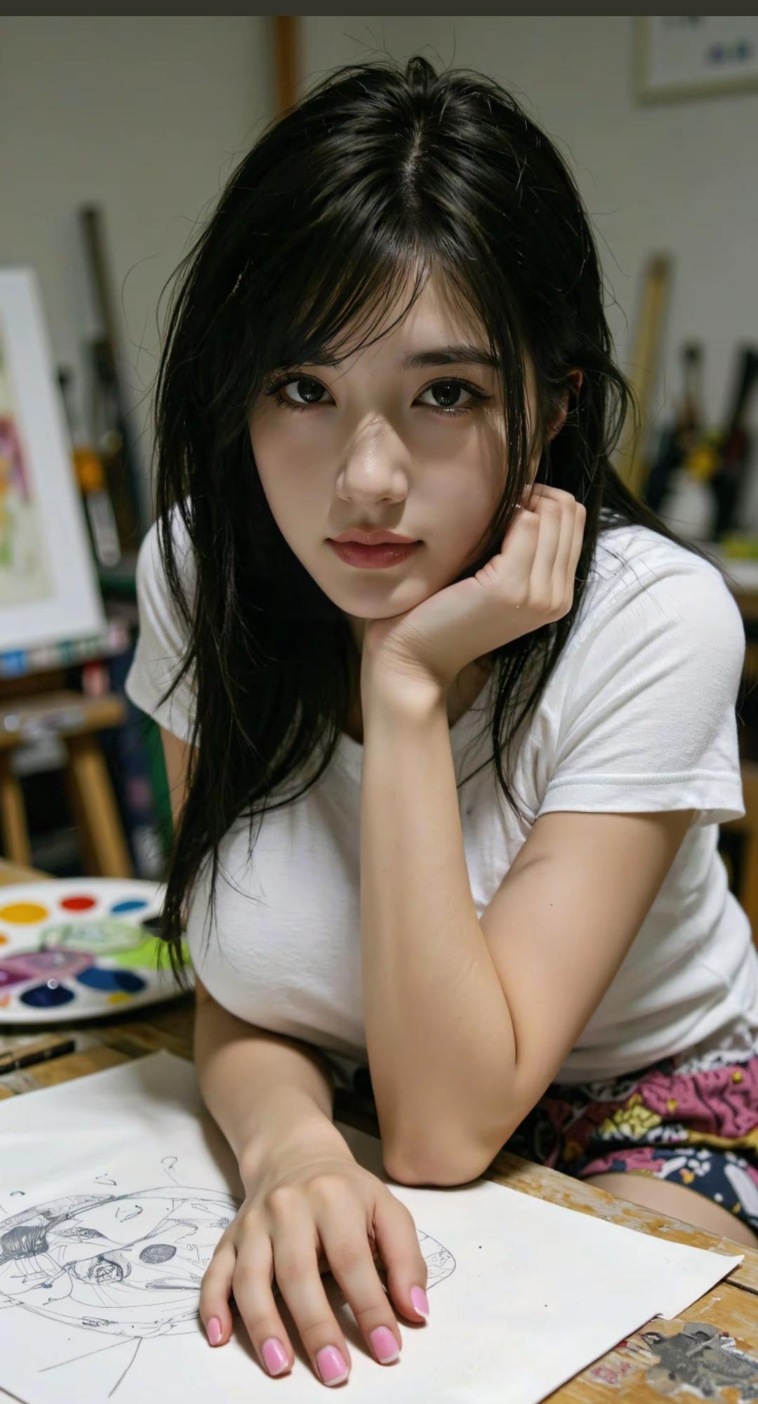 少女在墙角沉思,纯白背景,静谧氛围