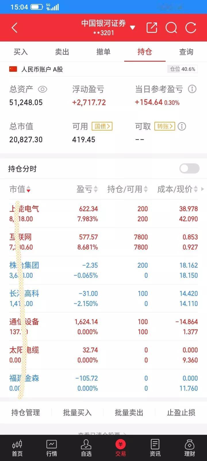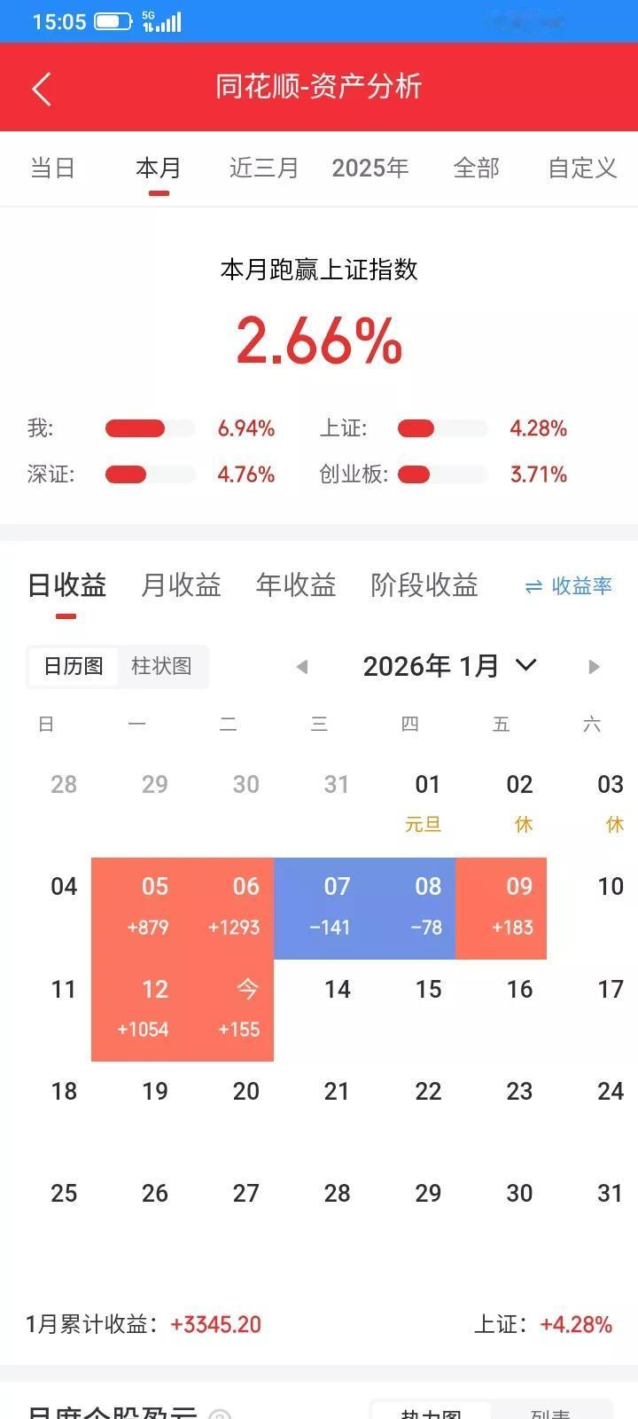 2026.01.13,今天又是惊心动魄的一天,上蹿下跳的,赚钱只是浮盈,亏钱才是实实在在的,今天又坐过山车了,一下子浮盈,一下子大亏,再又浮盈一点点。 通信设备今天低开低走,把昨天的浮盈全部亏完了,不过那些本来就不属于我的,赌徒只有离开赌场,口袋里剩下的才是自己的,还是按照计划,今天阴线,收盘卖掉,以1.377卖掉2900股,留下100股,今后好算账,可以方便看到盈亏情况。 互联网etf大幅高开,是属于我的规则的例外,舍不得卖,收盘反而下跌,按照网格交易应该补仓300股,红进绿出应该卖掉4000股,相抵后,收盘以0.927卖掉3800股。多卖了100股。 金森今天高开低走,又收出了阴线,昨入又错了,还是按照计划,阴线卖出,亏钱也要按照计划执行,收盘以11.77清仓卖掉600股,又亏了一百多块钱。 太阳今天低开低走,大幅下跌,亏钱也是要认了,收盘阴线,先卖出了吧,收盘以9.36清仓卖掉200股,昨天还赚一百多,一下子就吐出去了,还剩30块钱利润。 株冶今天高开高走,又贪心了,没有管住手,怕错过了,于是以18.18追高买入100股,买入之后就上涨,后来回落又以18.14又补仓100股,后来下跌了很多,但是收盘还是拉起来了,但是按照计划,收盘买的话,还可以买得更便宜一点。现在大盘处于高位,风险比较大,就不加仓了,就200股再试一试吧。 长鸿也是高开高走,怕错过了,回落中以14.20买入100股,但是收盘还是收阴线,又买错了,收盘以14.11卖掉昨天买入的100股,又多亏了二十多块钱。 今天上能真的太出人意料了,低开冲高了几分钱,然后逐步下跌,最低跌到37.56元,一下子亏了300块钱,但是还是按照计划,忽略盘中波动,等收盘如果真下跌再卖,多亏一点也无所谓,但是下午却触底反弹,大幅上涨,收盘收在当天最高价42.09元,收阳线,那就继续持有,下跌不怕,上涨更不怕,跌下来大不了就当没有买到吧。 今天持有的股票基本上都是下跌,etf也是下跌,还好1只股票,上能逆市上涨,弥补了全部亏损,还略有盈余。今天总市值2.08万元,总资产5.12万元,今天总体账户反弹回本154元。从亏几百块钱到收盘还赚一点点,虽然不多,也好,赚钱总比亏钱好。