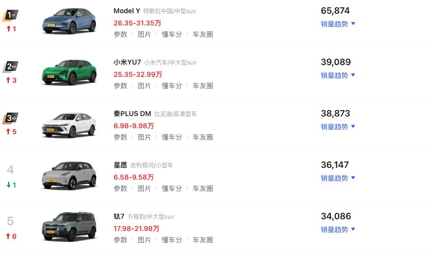 这么看,小米距离特斯拉的距离还是挺大的 十二月的特斯拉modely 的销量是65874辆 小米YU7的销量是39089辆 还有一半的差距,看起来特斯拉的老本国内车企还得在追一下 除此之外比较亮眼的就是方程版钛7 比亚迪的产品团队还是很有远见的 不知道有没有什么高人 王朝 海洋两大汽车品牌就已经很强了 没想到方程豹的爆款车型也出炉了 长城汽车真的该好好学习一下 大胆尝试才会有结果
