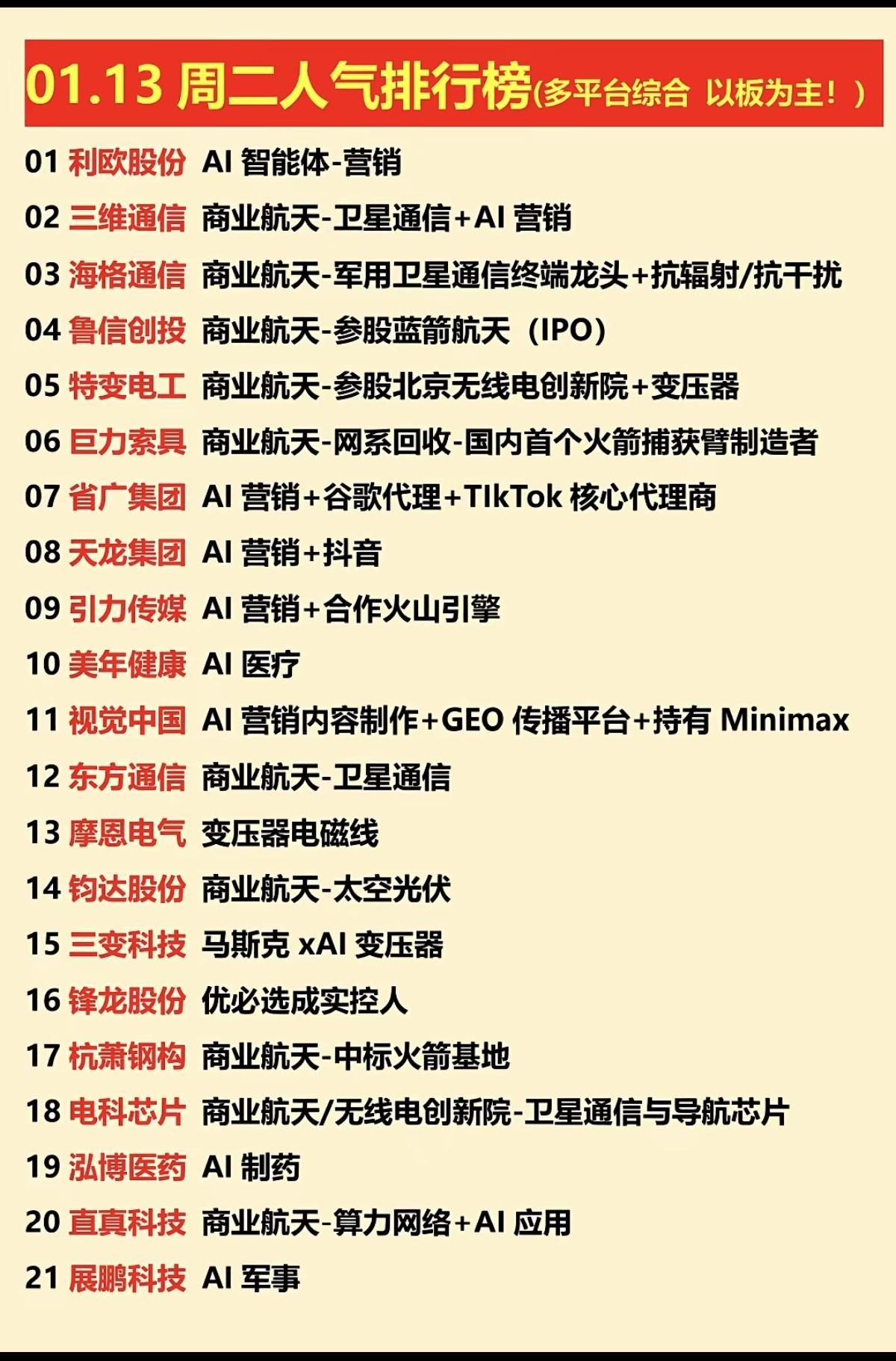 1.13周一 涨停板股票:人气龙虎榜! 1.智能体ai应用,ai营销 2.商业航天 3.存储芯片 4.变压器 5.优必选机器人