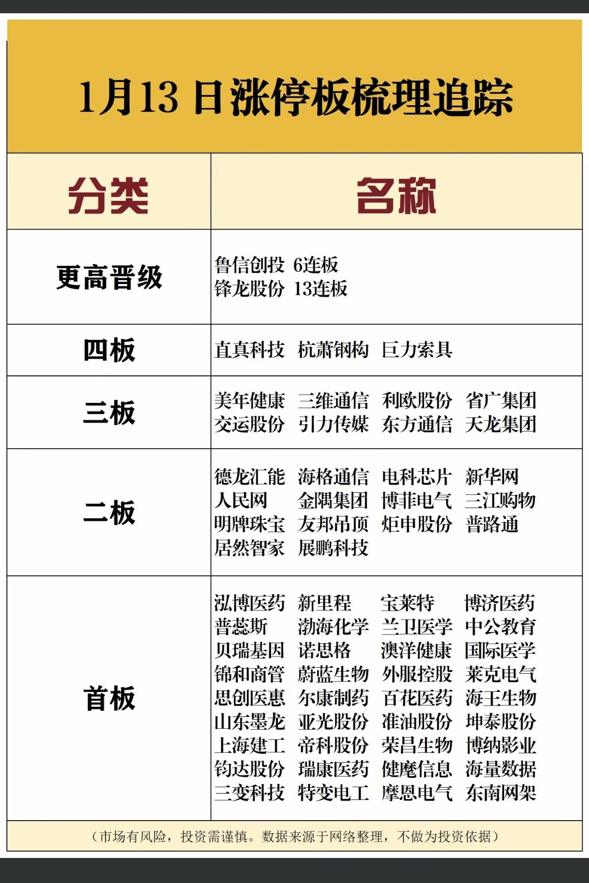 1.13周二 涨停板股票:连板高度! 机器人锋龙股份13连板 商业航天鲁信创投6连板