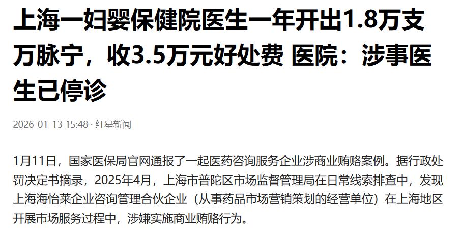 一年开1.8万支药,收3.5万回扣,这账我给大家算算。 上海一妇婴保健院的顾医生,被国家医保局点名通报了。 事情不复杂:一家药品推广公司为了让自家代理的"万脉宁"卖得好,找到顾医生,承诺开一支给一笔好处费。2023年一整年,顾医生开出了18275支,拿到手3.5万元。 我算了一下,平均每支回扣不到2块钱。说实话,这个数字让我有点意外——不是说回扣少就不该追究,而是这暴露出一个更可怕的问题:医药腐败已经渗透到了多细微的层面。 一支药赚两块钱的回扣,一年下来也能攒出3.5万。那些拿大头的人呢?那些真正吃肉的环节呢? 顾医生从业20多年,在生殖免疫领域算是有口碑的专家,门诊号提前一个月都挂满。现在停诊了,医院对外说是"身体原因",但明眼人都懂。 国家医保局这次通报说得很直白:商业贿赂的本质,是用回扣绑架处方权。药卖得好不好,不看疗效看返点。最后谁买单?患者和医保基金。 我最担心的是什么?是这种事被曝光后,大家的第一反应变成了"才3.5万,不算多"。 这才是最危险的。 当腐败变成常态,当回扣变成行规,当患者对医生的信任一点点被蚕食——这个代价,远比3.5万大得多。