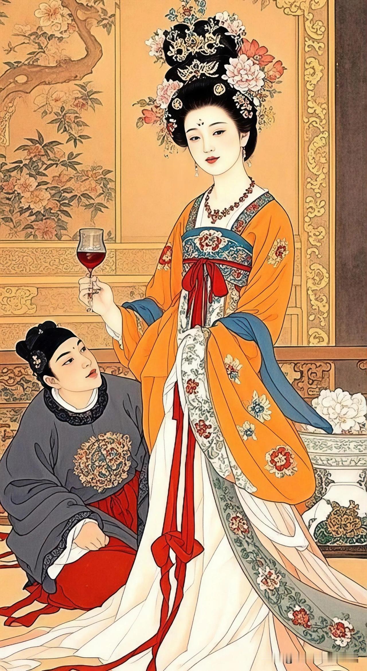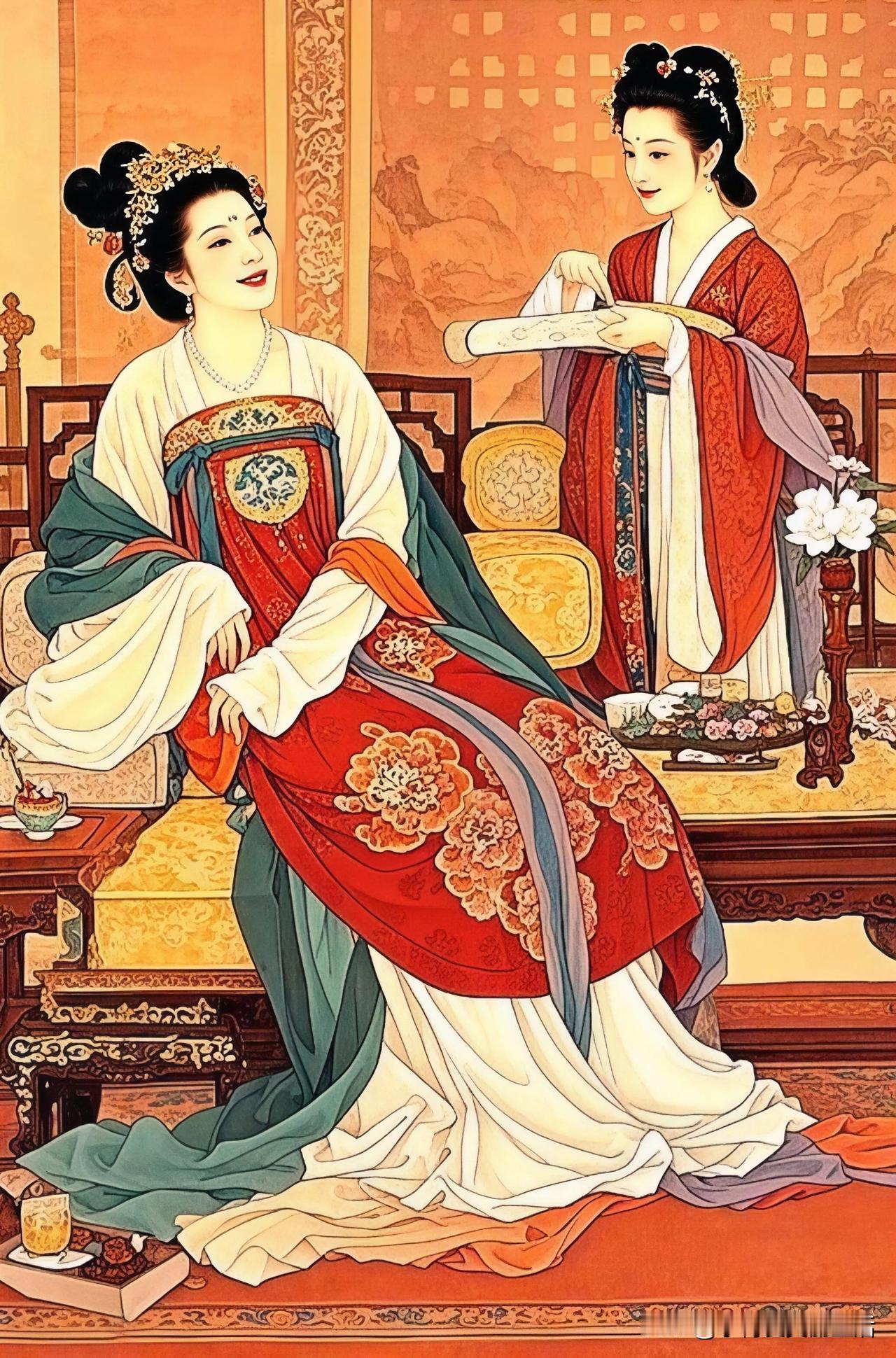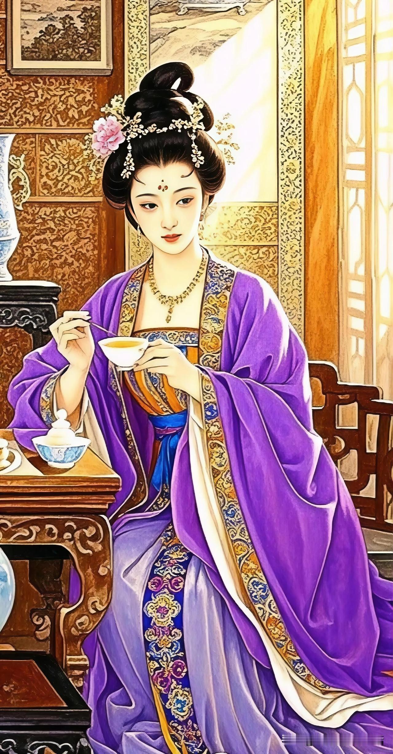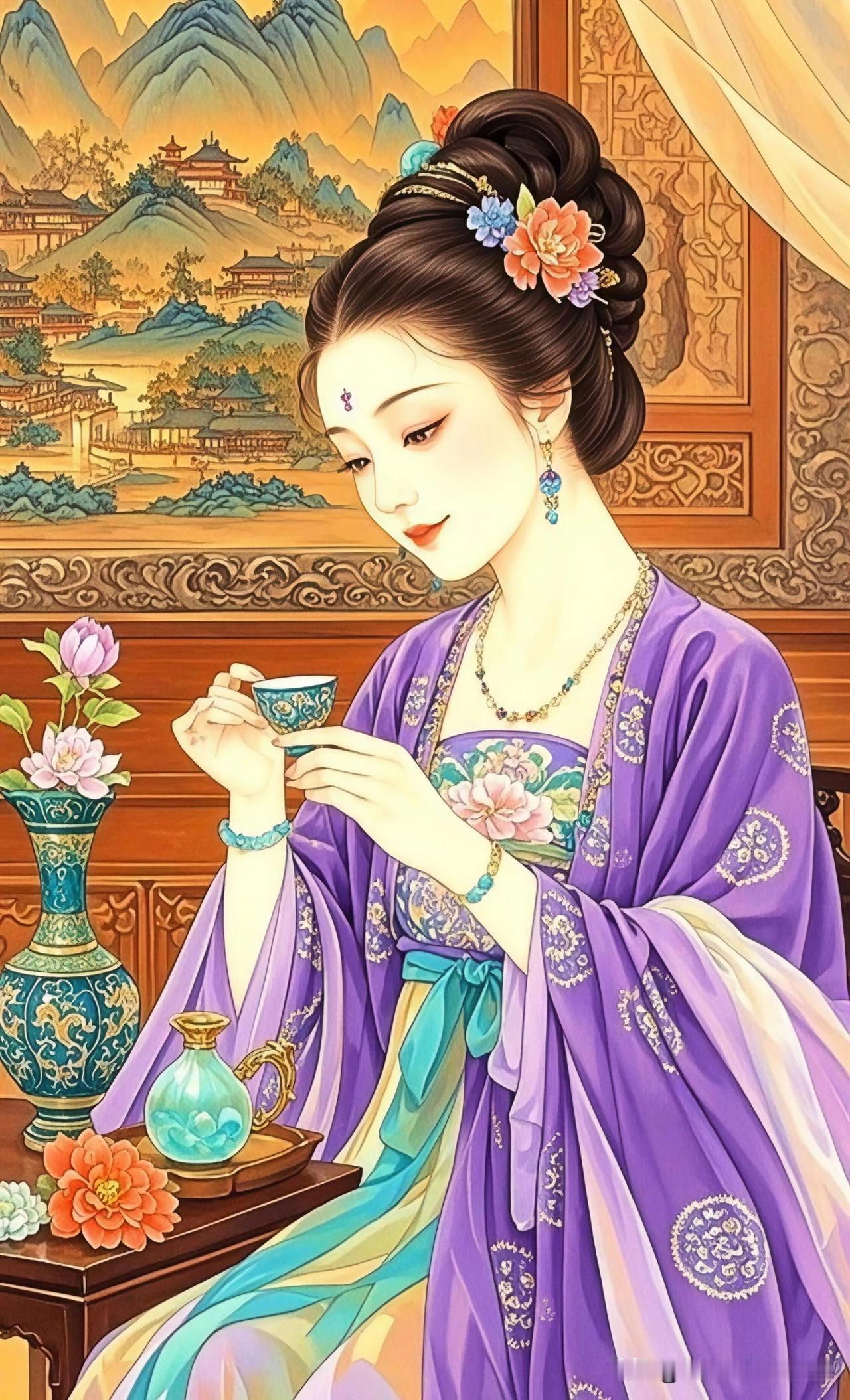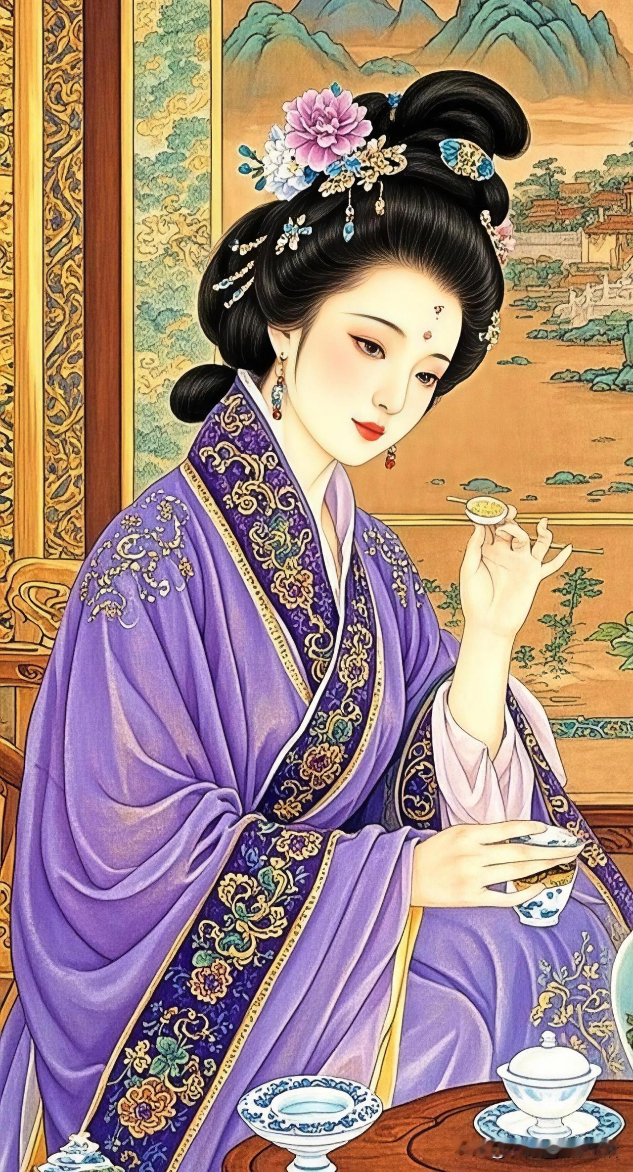 紫衣美人倚栏坐, 茶香满溢画中来。