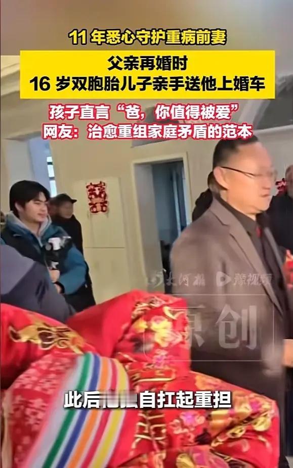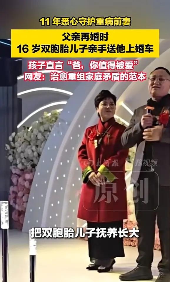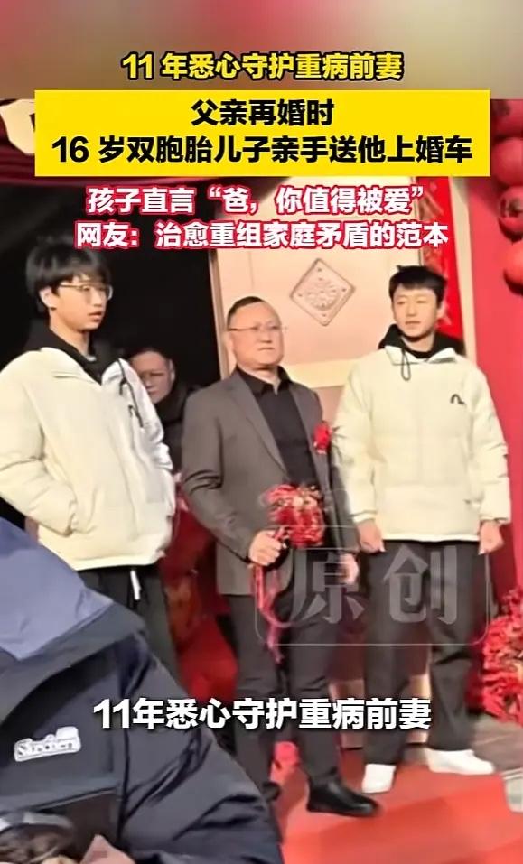 “看哭了!”1月12日,安徽蚌埠,一男子前妻查出恶性肿瘤,他不离不弃照顾11年,最终还是没能留住爱人,此后男子独自将双胞胎兄弟抚养长大,等男子再婚时,双胞胎兄弟也亲自将他送上婚车,并直言男子值得被爱。网友:伟大的父爱! 那天清晨十六岁的双胞胎兄弟换上整洁衣服,仔细帮父亲整理好西装领口,婚车到来时,两人一左一右搀着父亲手臂,轻声说“爸,以后要好好的”,稳稳将他送上车。这个简单动作,藏着这个家庭十多年风雨同舟的深情。 十一年前,刘先生妻子被查出恶性肿瘤,从此他过上单位、医院、家三点一线的生活。白天奔波赚钱支付医疗费,夜里守在病床前照料,回家还要给双胞胎喂饭洗衣。邻居们总见他累得在走廊长椅上睡着,可醒来第一件事永远是先照顾妻儿。 2011年确诊那天起,化疗、复查、病情反复,医院消毒水味成了这个家的日常。即便自己啃冷馒头,刘先生也把热饭菜留给妻子和孩子。十一年守护,他用行动告诉孩子:爱是不离不弃的坚守。 妻子离世后,刘先生既当爹又当妈,孩子的记忆中,父亲总在默默付出,那些年他的白发越来越多,笑容却从未离开过脸庞。 转机出现在现任妻子走入这个家庭,她没有刻意讨好,只是默默记得孩子爱吃的菜,生病时彻夜陪伴,像亲妈一样关心学业。她的善良,孩子们都真切感受到了。 当刘先生忐忑提出再婚想法时,双胞胎儿子几乎异口同声支持。他们私下商量过:“爸爸照顾我们这么多年,该有人照顾他了。”这份超越年龄的懂事,正是父亲十一年言传身教结出的果。 婚礼上,两个少年关上车门那一刻,完成的不仅是一场送别,更是一个关于爱与传承的闭环。真正的亲情从来不是血缘的独占,而是真心换真心的交融。 各位读者你们怎么看?欢迎在评论区讨论。