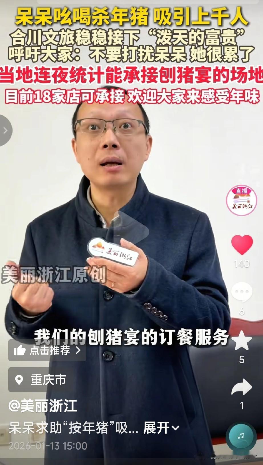 合川文旅局的领导出来替呆呆说话,他说呆呆是个很单纯的合川妹子,他知道大家都很喜欢呆呆,但是呆呆家的刨猪汤宴已经结束了。呆呆和父母这几天确实也很累了,让他们休息下吧。 还有想参加刨猪汤宴的朋友,可以去别家。现在合川已经有五家正在办刨猪宴。他们还对接了18家饭店,他们也有承接刨猪宴的能力,也可以订餐,欢迎大家去吃,提前感受年味。 不过我有个疑问,呆呆是让网友帮忙逮猪,再免费请网友吃刨猪宴。现在工作人员说可以通过酒店预订,是免费的,还是花钱订餐?如果是免费的,那酒店亏大了。如果是花钱,那哪里都能吃到猪肉啊? 对于这件事,你怎么看呢?