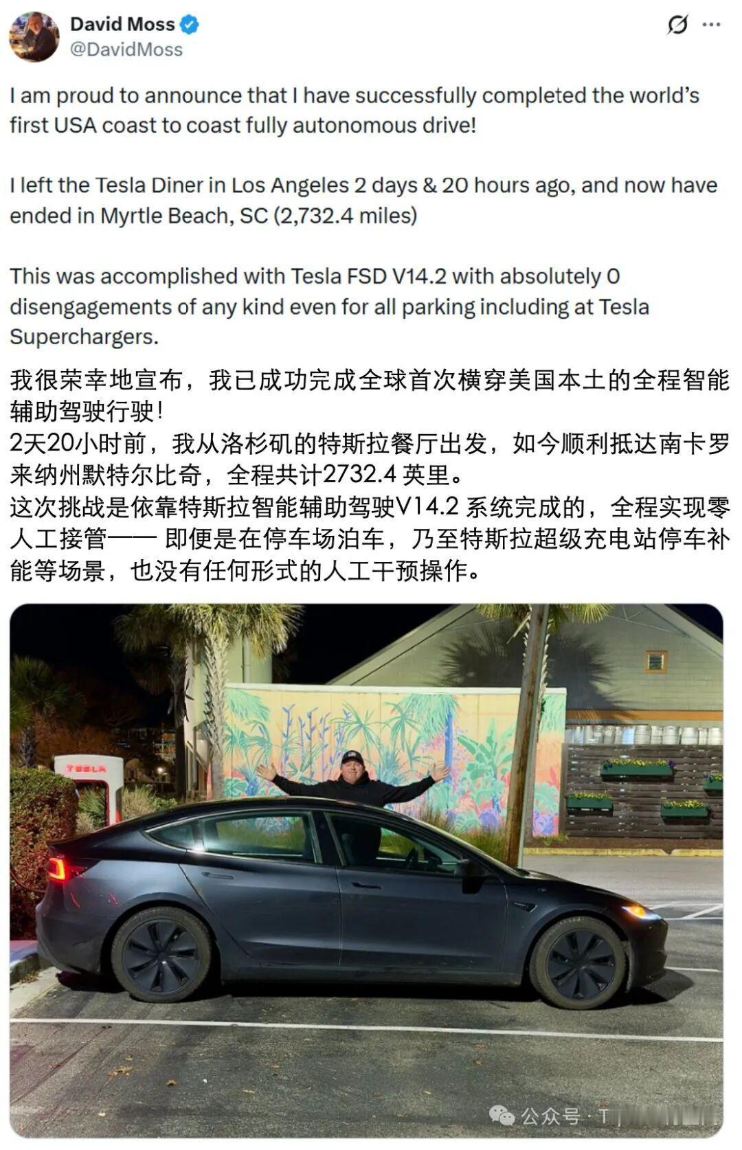 你能想象,坐在驾驶座上,看着车自己开过1.6万公里,而你一次方向盘都不用碰吗?这不是科幻电影,而是特斯拉车主@DavidMoss 刚刚完成的真实壮举。 他驾驶Model 3,全程启用智能辅助驾驶,无人工干预穿越美国24个州,创造了全球公开纪录。更酷的是,其中一段约4400公里、横跨美国东西海岸的旅程,也实现了全程零接管,连进出超充站都是车辆自己完成。 这意味着什么? 1️⃣对车主而言:这是前所未有的轻松体验。他分享了途径的近30个超充站坐标,并感慨旅程“非常轻松”。技术正在将长途驾驶从一种“劳动”转变为一种“监考”甚至“陪伴”。 2️⃣对行业而言:这是一个强烈的技术信号。虽然法律上仍属于“辅助驾驶”,需要驾驶员监督,但特斯拉的V14系统通过端到端神经网络,展现出了应对复杂、长距离、全场景的惊人稳定性和类人决策能力。 这一天,或许比很多人想象的更近。你的车,准备好成为你的“AI司机”了吗?【来自懂车帝车友圈】