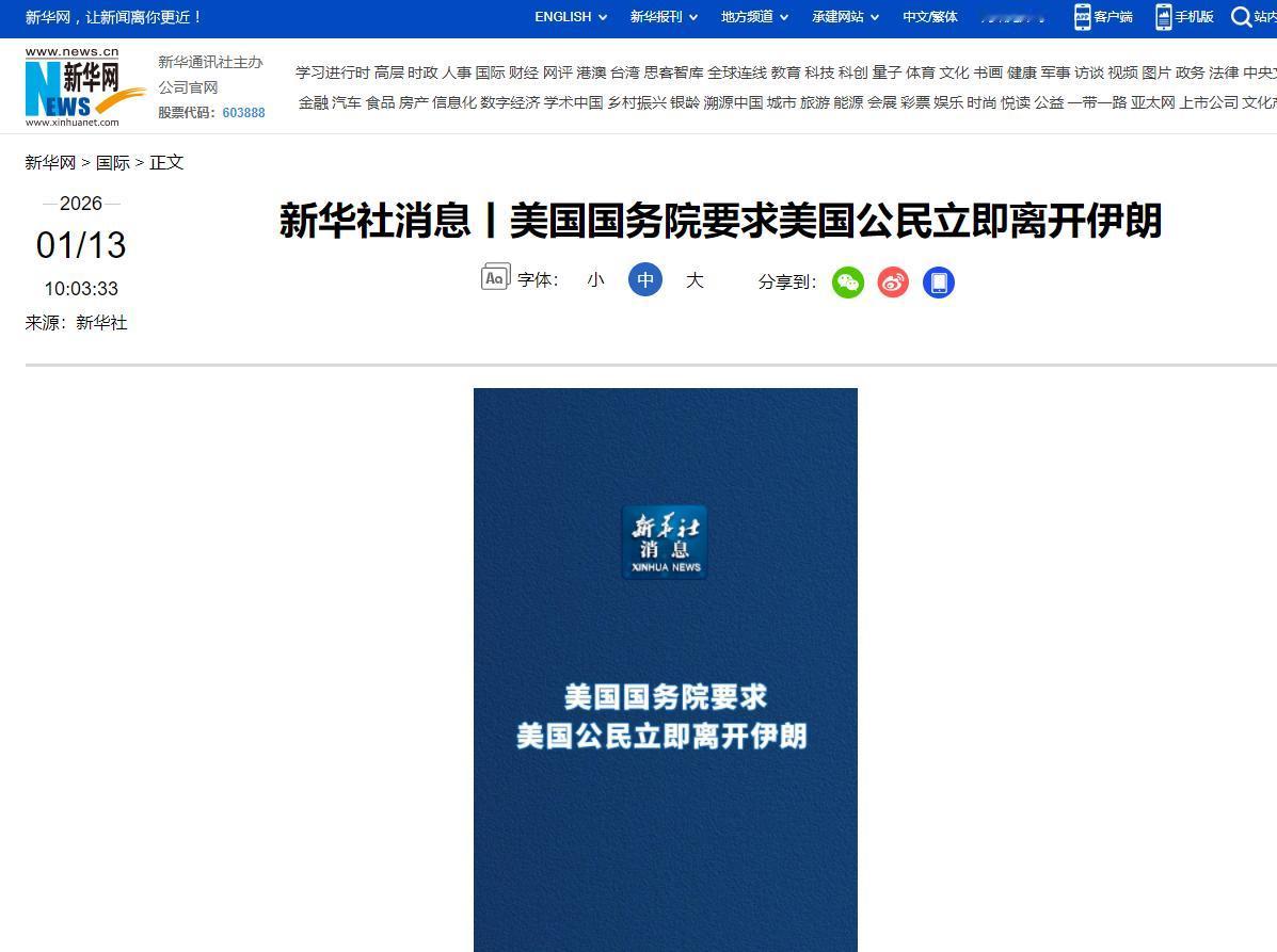 美国终于按耐不住要全面对伊朗下手了? 新华社消息,美国媒体12日报道,美国国务院要求公民立即离开伊朗。懂点国际事儿的都清楚,这根本不是简单的安全提醒,就是美国要对伊朗动真格的信号,说白了就是动手前先“清场”,把自己人撤出来,免得后续被抓了当人质。 这种套路美国以前用了好几次,每次撤完侨就跟着搞强硬动作,这次对伊朗肯定也一样。 大家想想,美国只要想打哪个国家、搞颠覆,提前撤公民都是固定操作。远的不说,2003年伊拉克战争前,美国先分批撤了外交官家属和普通公民,最后使馆非必要人员全撤光,没多久就全面入侵了。 2011年利比亚内战前也一样,先下撤离令,接着就联合欧洲国家开打。这次美国对伊朗下的是“立即撤离”的死命令,连陆路撤离路线都指出来了。 紧迫感比之前还强,就是要彻底清空伊朗境内的美国人,好没有后顾之忧地动手。 别以为这只是单纯的安全预警,美国最近的一连串动作早有预谋。就在下撤离令当天,美国又对伊朗加了25%的惩罚性关税,这已经是2025年底以来第三次加码制裁了。 之前早就切断了伊朗85%的跨境金融交易,现在又搞关税,就是要彻底掐断伊朗的经济命脉。 数据就摆在这儿,伊朗货币兑美元都跌到146万比1了,去年12月通胀率高达42.5%,食品价格比去年涨了72%,老百姓连饭都快吃不上了,美国就是想把伊朗经济搞垮,让它内部先乱起来。 经济上逼还不够,军事上美国也步步紧逼。现在美国在中东的伊拉克、卡塔尔等基地部署了好几万士兵,还有数百架作战飞机、坦克,全都准备好了。 更要注意的是,特朗普都明说了,在考虑包括军事打击在内的强硬手段,军方还在研究具体方案,甚至想打伊朗的基础设施。 特朗普第二任期一上来就搞强硬外交,早就退出了伊朗核协议,现在又借着伊朗国内的抗议活动找借口,明摆着是为全面下手做铺垫。 美国这么逼,伊朗也没软着。伊朗议会发言人已经放话,要是美国敢动手,就把以色列和美国在中东的军事基地全当成打击目标。 这可不是说空话,2020年美国无人机杀了伊朗将军,伊朗直接发射导弹炸了伊拉克的美军基地,伤了好几个美国兵。 现在伊朗革命卫队已经高度戒备,在霍尔木兹海峡部署了数百艘快艇,还加紧造无人机,各地几十万老百姓也上街抗议,谴责外国干涉,支持政府对抗美国,这都是被美国逼出来的。 其实美国早就开始铺路了,有官员透露特朗普要和顾问开会敲定具体方案,不光是军事打击,还打算搞网络攻击、加制裁,甚至帮伊朗的反政府势力。 盟友以色列也在背后推波助澜,去年6月还和伊朗打了12天,现在也提高了警戒级别。 美国就是挑了个坏时候,伊朗现在内忧外患,内部因为经济问题有抗议,外部被美国盟友围堵,想趁这个机会一举打垮伊朗,掌控中东的石油,进而握住全球能源命脉。 再回头看美国让公民撤伊朗这事儿,绝对是动手前的最后信号。美国以前每次大规模撤侨,后面都跟着硬动作,这次对伊朗,经济、军事的招都用遍了,就差最后一步。 伊朗虽然做好了应战准备,但面对美国全方位打压,局势已经很危险了。说白了,美国已经按耐不住了,全面对伊朗下手只是时间问题,这肯定会让中东更乱,也威胁全球和平稳定,实在让人愤慨又担心。