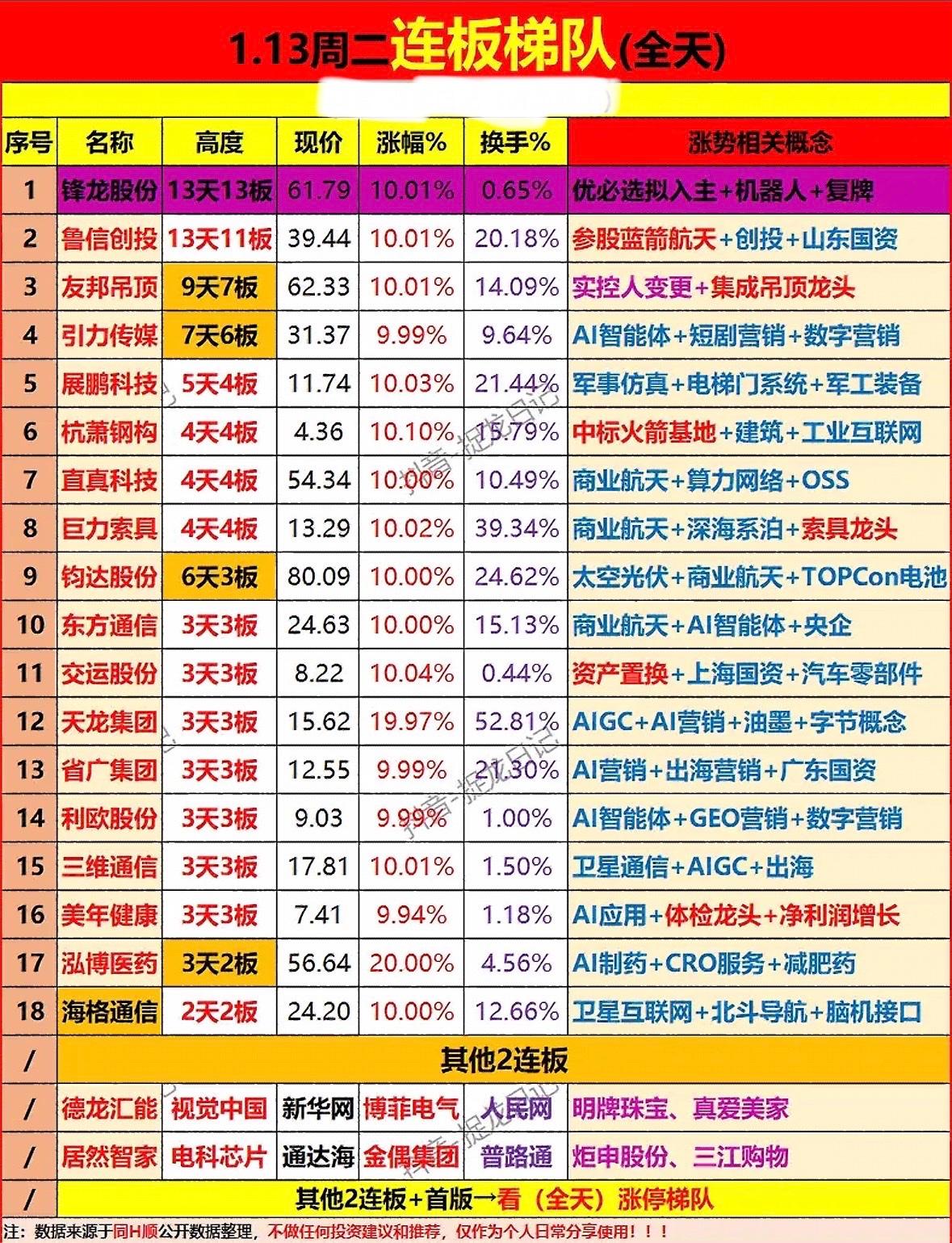 "1月13日今天连板梯队 多股连板爆发!锋龙13连板领涨,机器人概念火热,钧达太空光伏受捧,省广AI营销走强,军工通信活跃。" 商业航天、AI智能体概念股强势领涨,多只个股连板飙升,市场热度聚焦科技与创新领域。