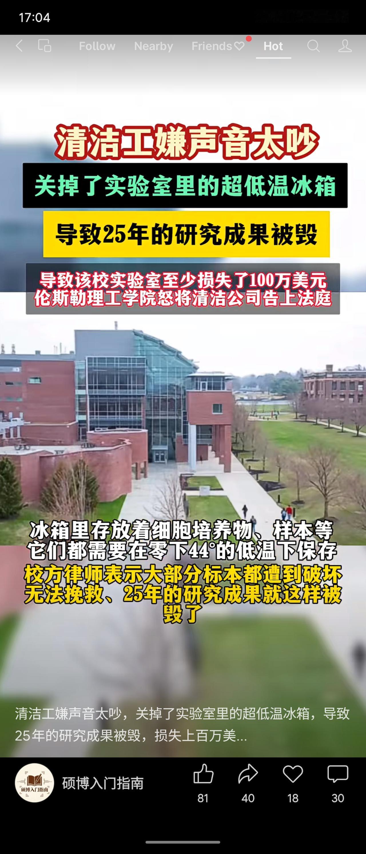 一名清洁工因嫌噪音大,关闭了实验室的超低温冰箱,致使需要-44℃保存的细胞样本等材料被毁,造成该研究机构约100万美元的损失,一项长达25年的研究成果因此中断。