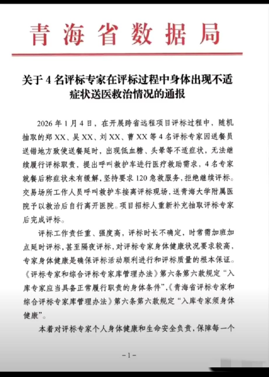 4专家因送餐延误身体不适拒评标。 整件事挺魔幻的:4名专家称因为送餐延误,出现低血糖、头晕等不适症状,无法继续评标。 安排就餐后称症状未有缓解,坚持要求120急救服务,拒绝继续评标。 无奈,工作人员呼叫救护车送医救治,就医后四人自行离开医院。项目招标人重新补充抽取评标专家后完成评标。 到底什么标啊,这四名专家到底是真病了,还是借机拒绝评标?[允悲][允悲][允悲]评标专家 招标评审专家 评标奇葩事