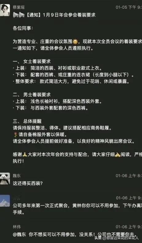 好大的官威啊! 统信这家2000多人的操作系统公司,年底开年会,董事长直接把地点定在了自己家乡武夷山。更离谱的是,平时穿惯格子衬衫的技术员们,被要求必须西装革履参会,有员工抱怨一句,直接被点名去办离职。 据说阿里、腾讯这类大公司的年会都没这着装要求,毕竟年会就是年底大家放松乐呵的场合,哪能搞得跟庄严会议似的。最后统信的西装率倒是100%了,可群里抱怨一句就被辞退这操作,真是让人咋舌。上一个这么耍官威的,还是东方小孙在直播间摔手机训人的事儿。 还有人调侃,被点名离职的员工叫“黄林”,董事长叫“林伟”,这是犯了人家的忌讳,哪能让人“黄”了呢。 年会本该是凝聚团队的暖心时刻,靠强硬手段摆官威,只会伤了员工的心。企业管理要讲人情味和尊重,把员工当伙伴,才能真正留住人、稳住团队。