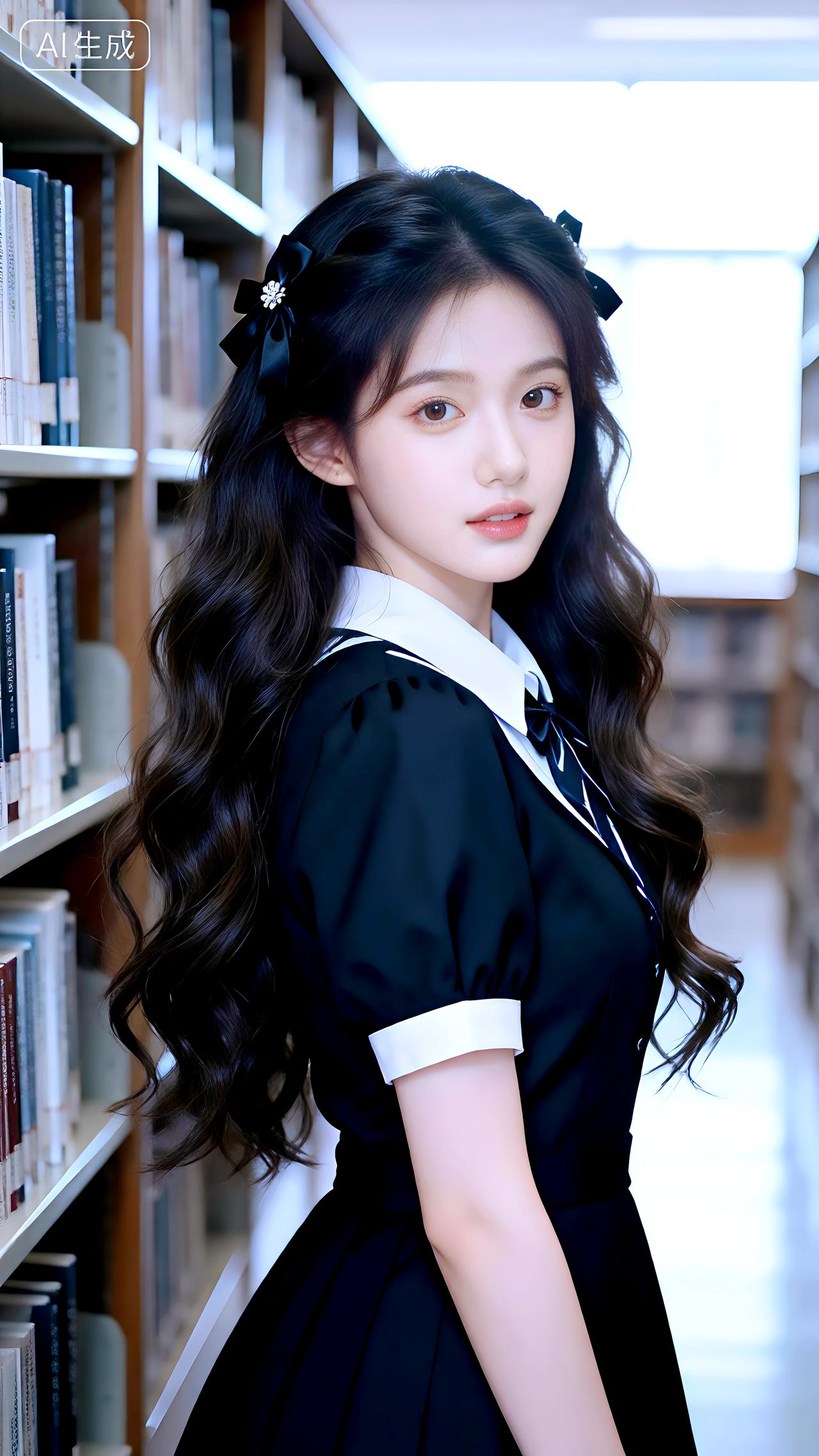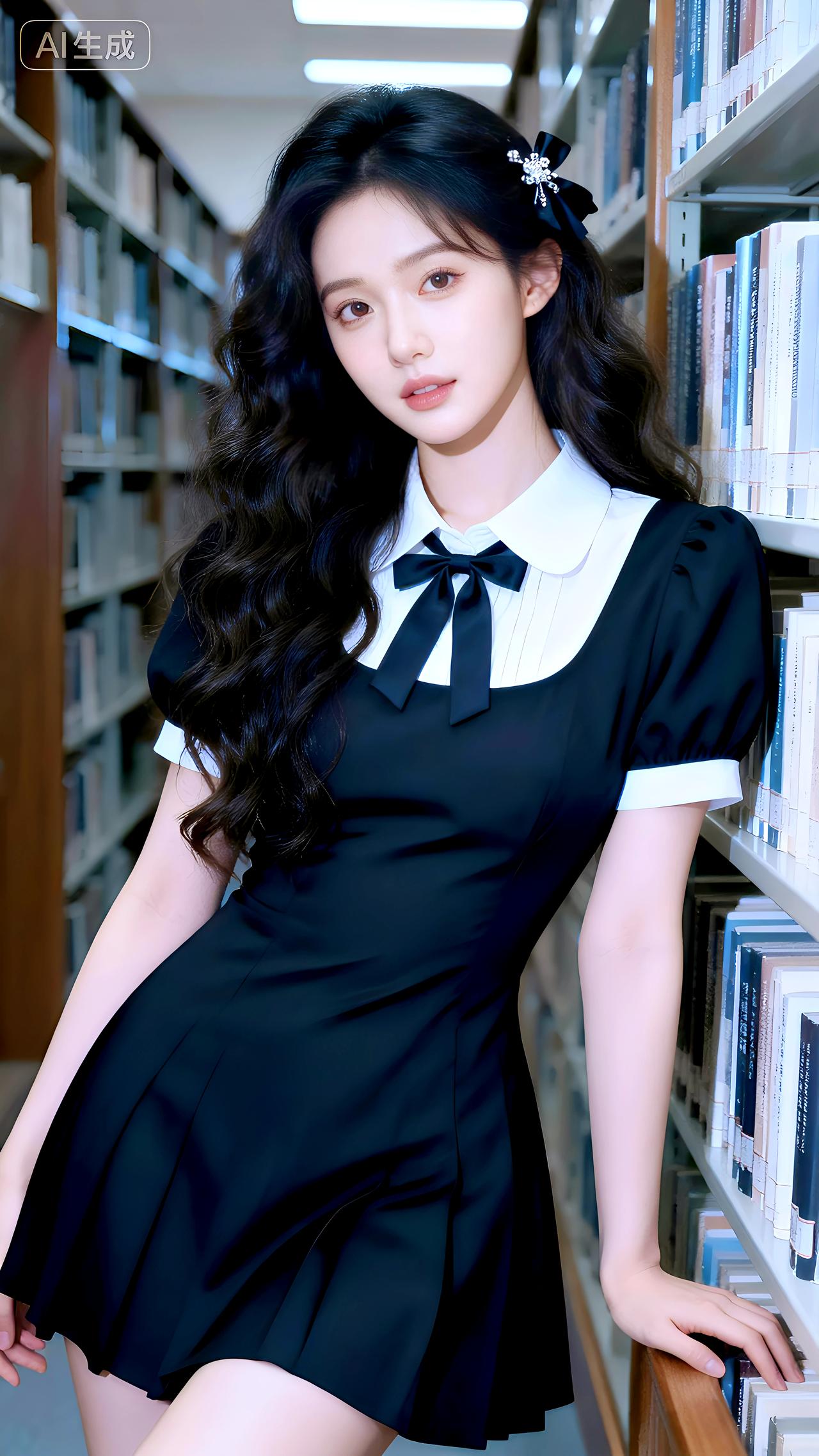 书香侧影佳人笑,黑裙长发梦轻摇。