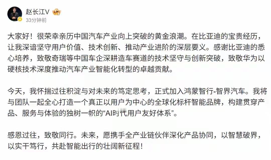 放言智界v9三年无对手,赵长江离任比亚迪,上任智界 今天赵总在各大平台发表了文章,感谢了老东家比亚迪汽车,赞扬了比亚迪过去对他的培养,底下好多人评论走的对,毕竟比亚迪是家族式的管理,让很多人工作起来有点束手束脚 带着腾势D9的成功案例,来支援智界绝对是非常正确的抉择