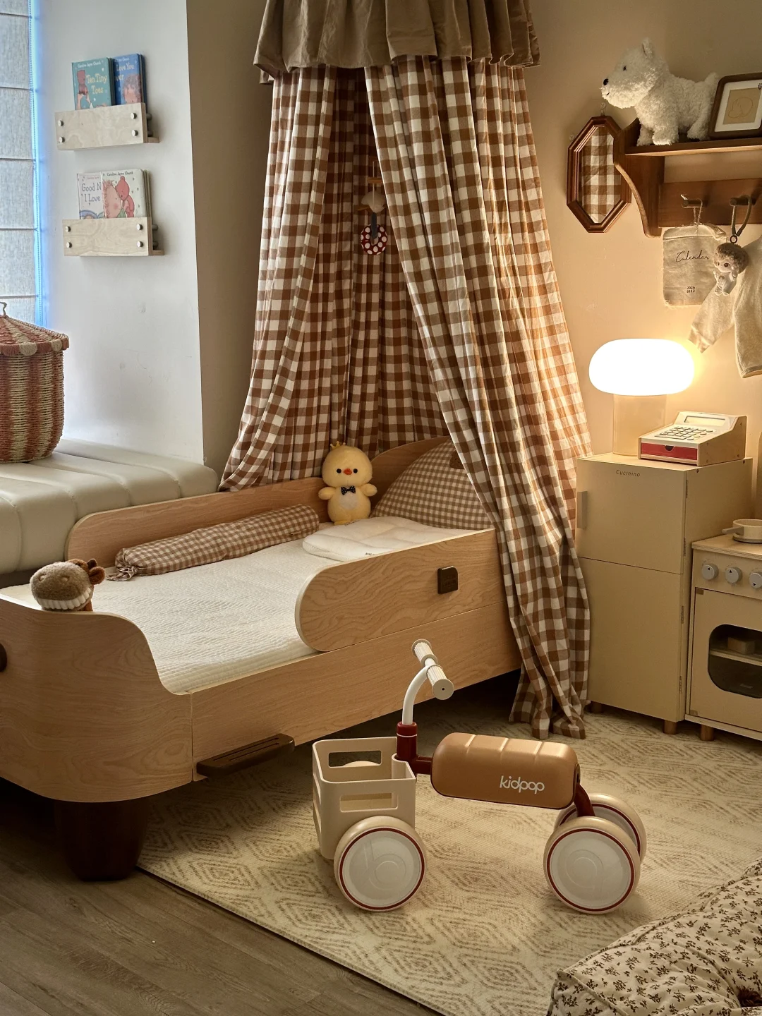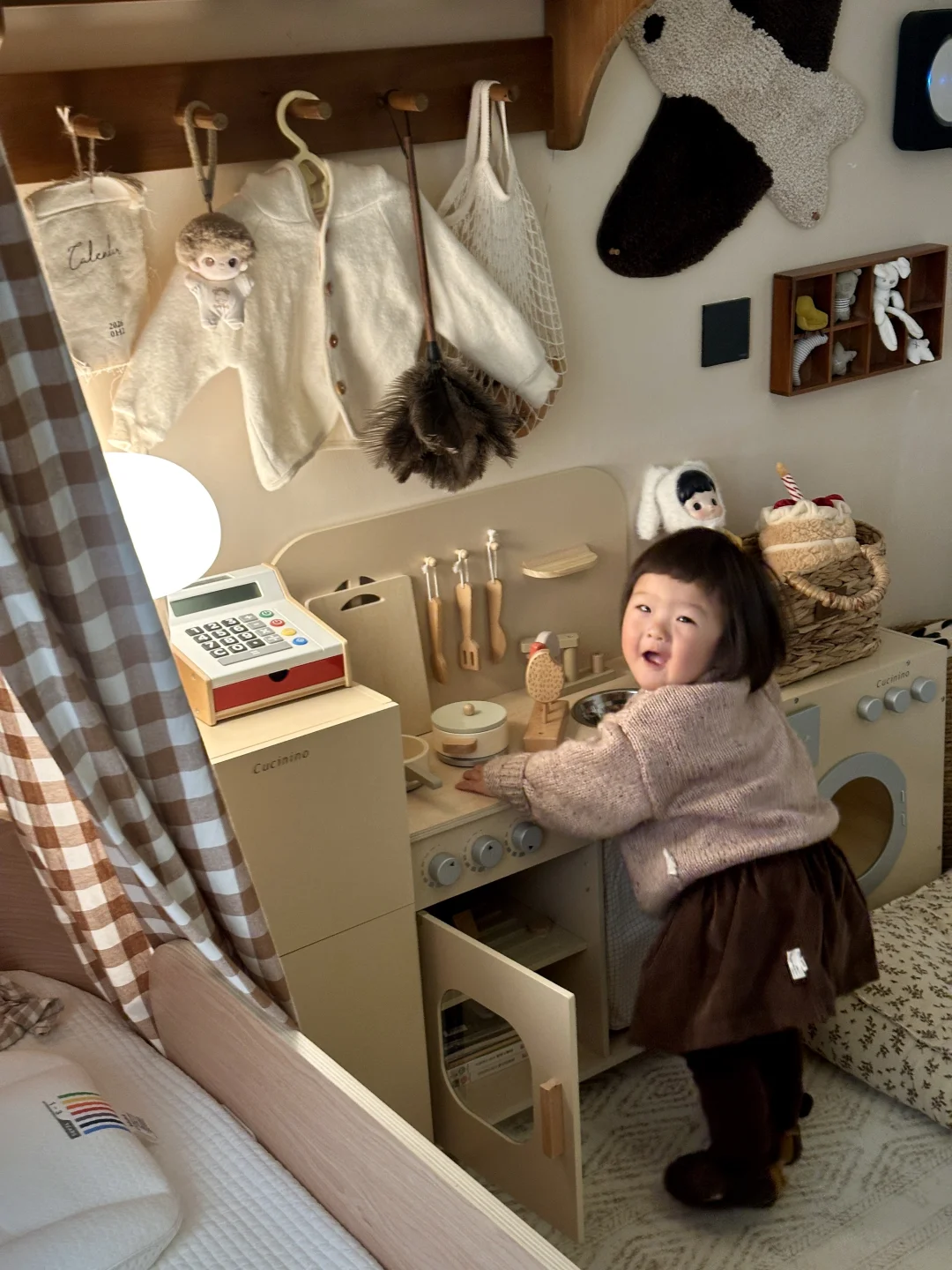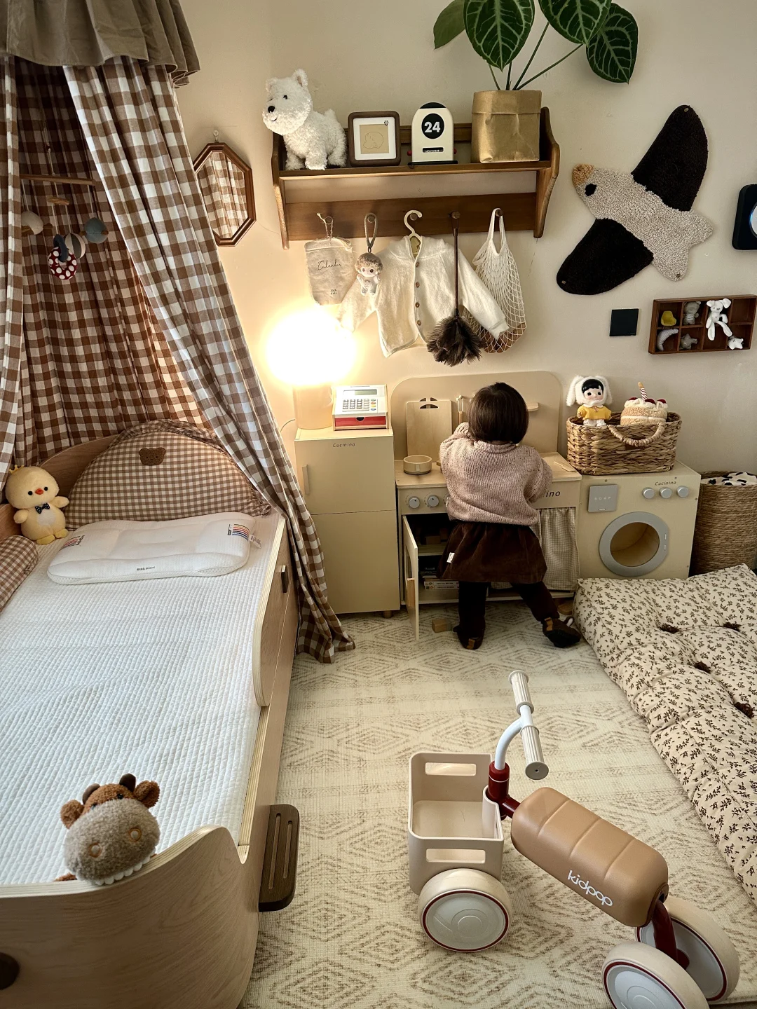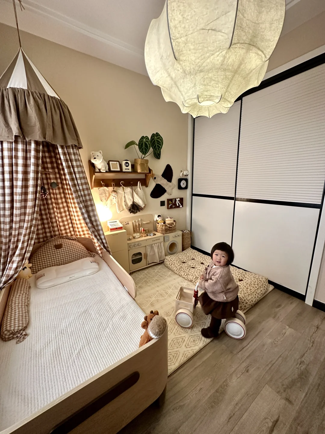 哈喽,我们是爱生活的Mark托夫妇👩❤️👨 . 一岁三个多月的女娃, 房间不必是“精致样板间”。 我想要的,是让她能光脚乱爬、扶站玩耍、 坐着看绘本——让她自由探索,充满活人感的家! . 给房间「留白」的重要性☑️ 今天推学步车, 明天可能只是想躺平发呆。 房间跟着她的成长“流动”, 我不急着一口气填满。 丰容不是堆满“儿童产品”, 而是让环境有呼吸感。 她在这样的房间里, 自由无忧的成长。 你的家,也需要一点“不完美”的丰容。