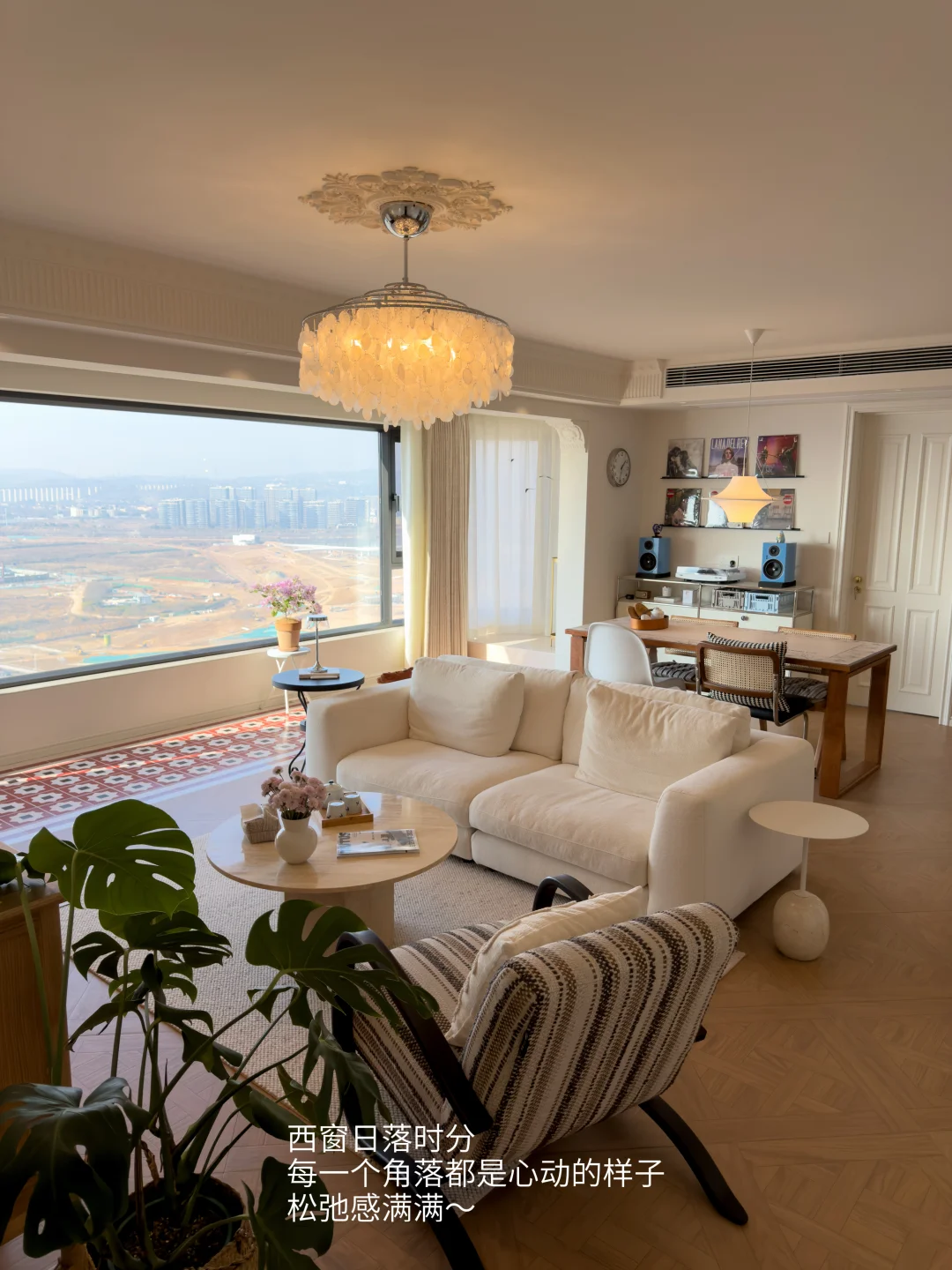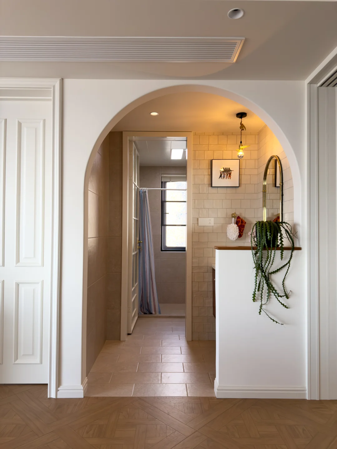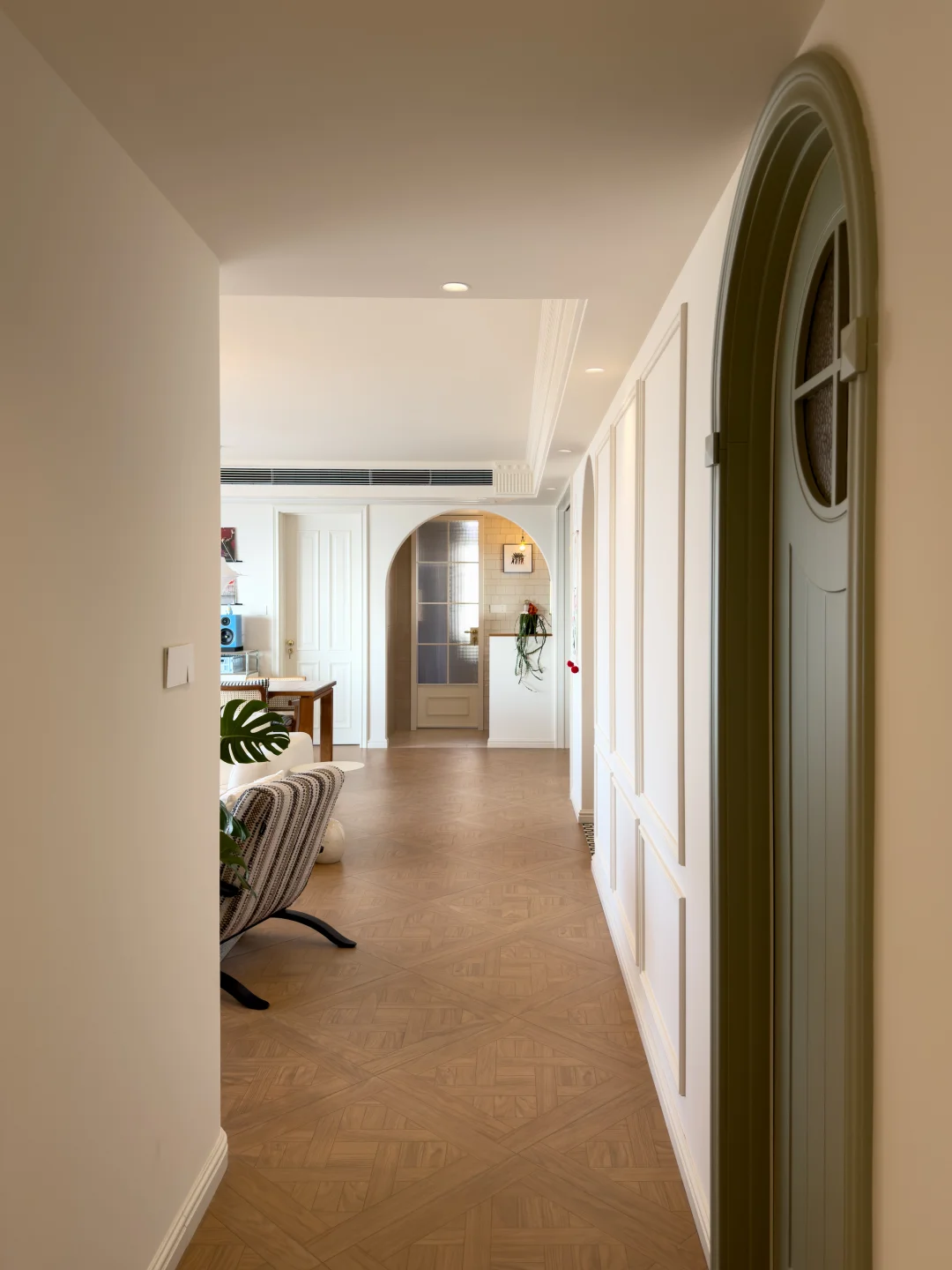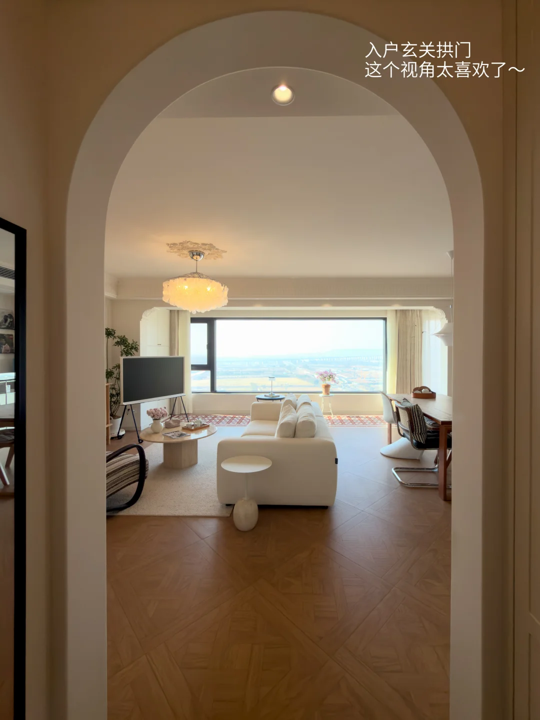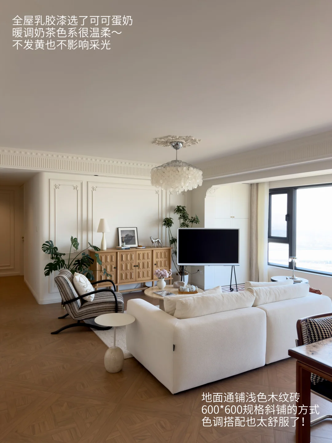 欢迎参观我们装修落地的新家˙✧˖°📸 ༘⋆。° 🏠建面162平,套内146平,4室2厅2卫 ✨🥂自然系法式复古,装修干货分享📝~ · 业主说入住以后,每天只想待在家里哪也不想去🥹 家里的一切都是按照自己的喜好和想法布置的🪄 每一个角落都是心动的样子,这大概就是装修的意义吧🤍~ · 🧾干货经验分享 1️⃣全屋通铺浅色木纹砖,600*600规格斜铺,和法式白色调适配度拉满,阳台和卫生间做了不同样式的花砖,大气又耐看! 2️⃣乳胶漆选了可可蛋奶,暖调奶茶色系温柔到哭,不发黄还不影响采光。 3️⃣全屋定制柜+实木烤漆房门,与乳胶漆同色,搭配金色复古拉手、门锁,法式复古的精致感拉满~ 4️⃣硬装造型做圆拱门、弧形垭口、pu线条勾勒、珍珠转,法式灵魂直接拿捏! 5️⃣软装搭配复古吊灯(花瓣/贝壳造型),布艺沙发、大理石茶几、配米白色亚麻纱帘,阳光透进来的时候,氛围感满满~ · (以上图片内容均为原创实拍案例‼️) · 𝐀𝐛𝐨𝐮𝐭|优木工房 深耕浙江地区全屋家具定制16年 家居美学|实拍案例分享|全屋定制|一站式服务 📝定制范围: 衣柜|橱柜|玄关柜|餐边柜|电视柜|书柜书桌|塌塌米|护墙|房门…等全屋木作 ·