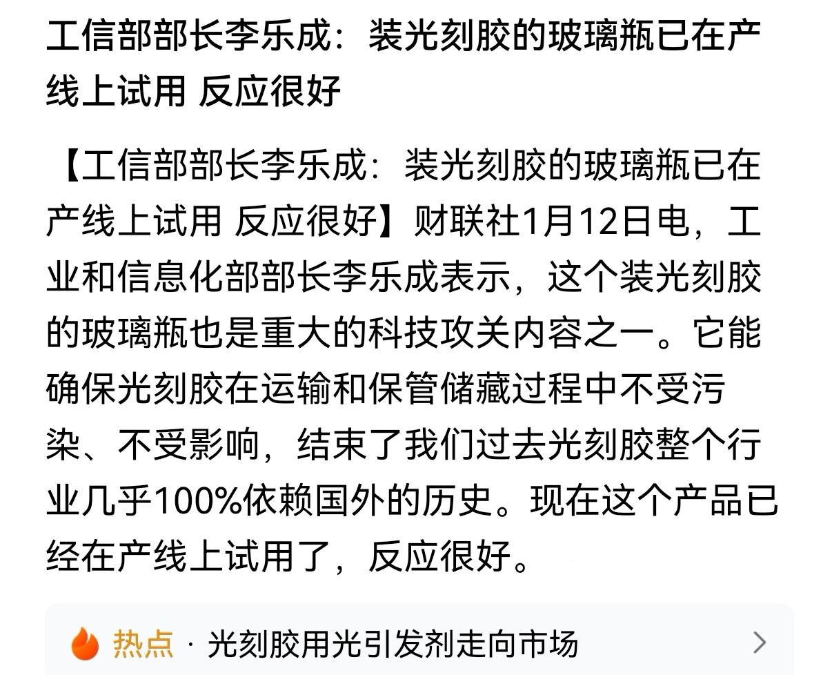 字越少、事情越大! 今天中国,装光刻胶的玻璃瓶已在生产! 这玻璃瓶可是重大科技攻关成果。它能保证光刻胶在运输和存储时不受污染,直接结束了过去光刻胶行业近100%依赖国外的历史。现在产品已在产线试用,反馈很棒。这一小玻璃瓶,背后是我国科技领域的重大突破,以后在光刻胶存储运输方面咱也有了自主保障,期待它助力我国科技产业迈向新高度! 光刻胶是半导体产业的重要耗材,以前技术主要是日本公司掌握。现在,既然我国装光刻胶的玻璃瓶都在生产了,那肯定光刻胶也是能生产了,突破日本封锁指日可待! 半导体