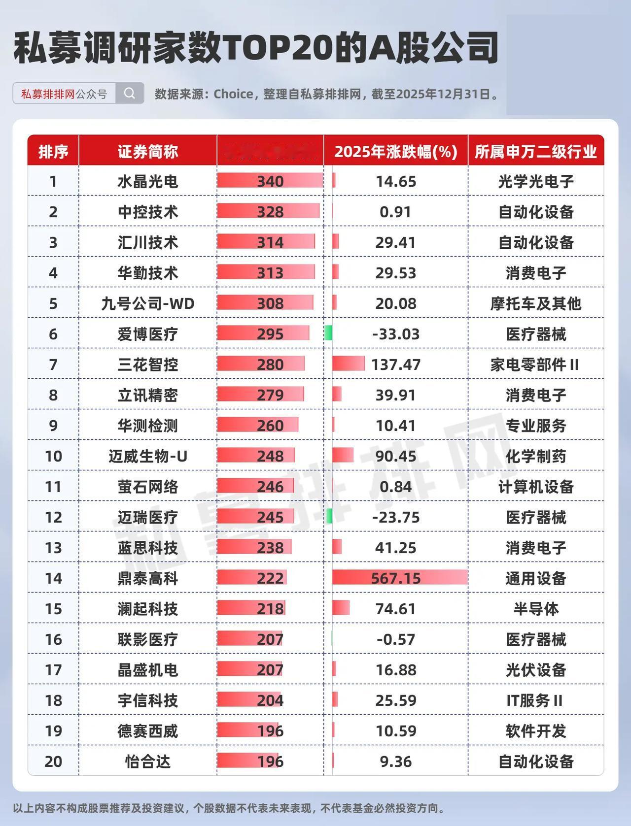 私募调研股票排名榜(2025年度) (向右滑动图片查看完整名单) 2025年国内私募行业规模突破22万亿关口,私募机构数量经历有序压降后逐步趋稳,行业生态持续优化。 行业活跃度同步走高,全年共有4525家私募机构,对4611家A股上市公司展开调研。 2025年机构调研最多的股票排名 从所属行业来看,私募机构调研的这批A股上市公司,来自自动化设备、消费电子、医疗器械等领域的居多,各有3家。 从涨跌幅来看,有222家私募机构调研的鼎泰高科表现亮眼,其所属行业为通用设备,2025年涨跌幅达567.15%。 从调研家数来看,来自光学光电子领域的水晶光电,获得340家私募机构调研,颇受市场关注。