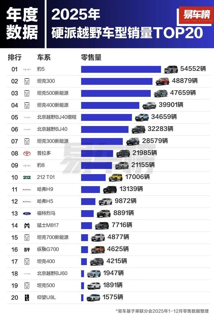 大家有没有发现,车子越来越大,越来越方了,以前轿车是最爱的车型,现在SUV因其空间性能和场景适用性,成为市场最爱,而这几年户外风成型,硬派越野崛起,方盒子车型越来越多,据说进藏路上有一半车型是方盒子,最典型的莫过于长城的坦克系列,而去年底比亚迪方程豹又横空出世,方盒子车型风起云涌,那么去年硬派越野和方盒子销量如何呢?