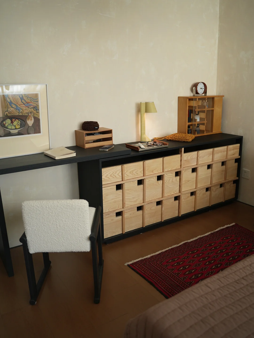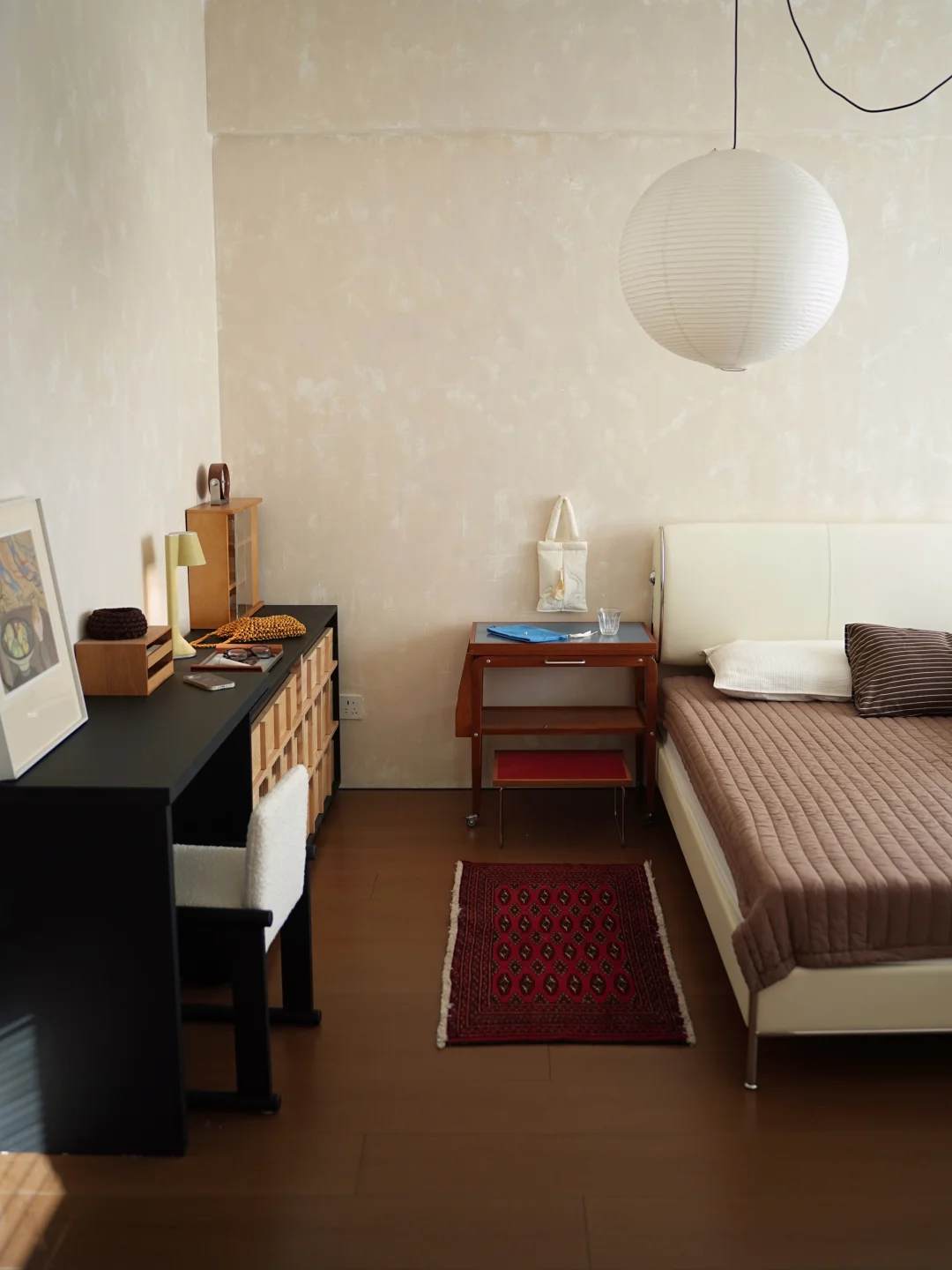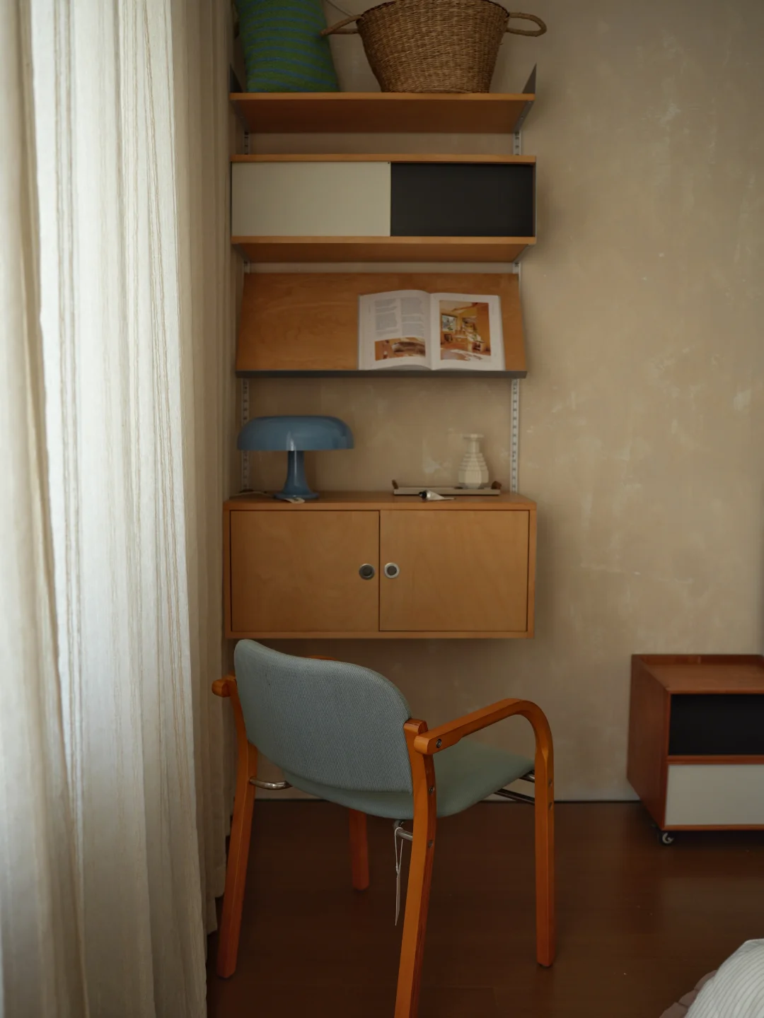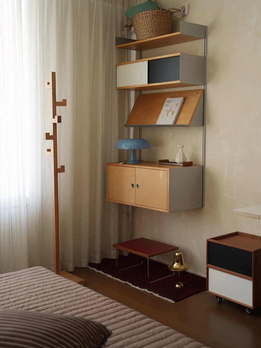 床尾柜换了桦木色的 感觉比较清新了一些 也有更多的展示和储物空间了 再加上床边的书桌斗柜 基本可以满足一个人居住的收纳需求 另外一个房间有个衣帽间 外套就挂着 抽屉收纳短袖和薄衫 复古风 又整洁的卧室 住起来真的很舒服