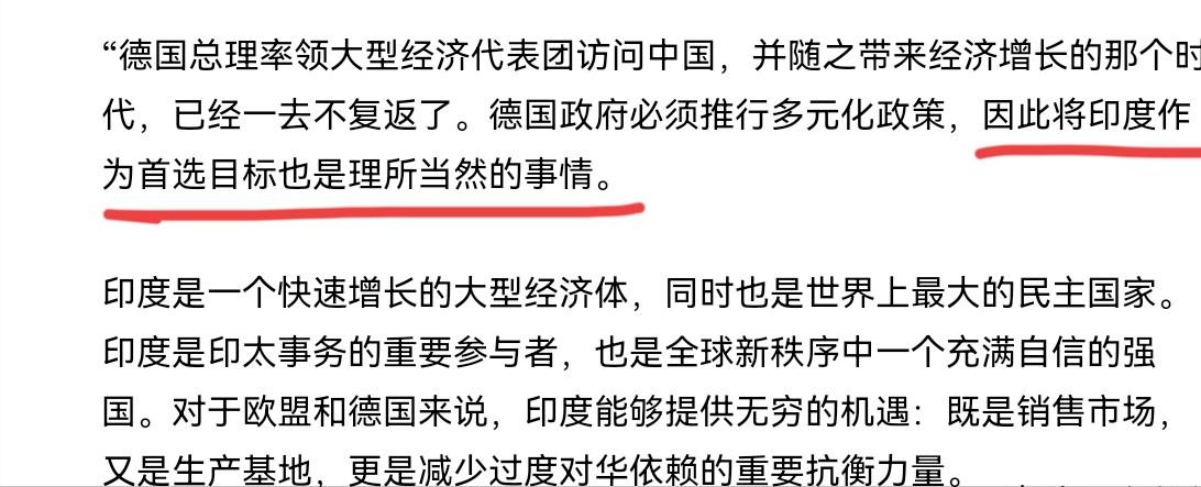 德媒表示,中国已经不是德国在亚洲最为重视的国家,印度成为了德国最优先的新伙伴! 1月12日,根据德国之声报道,德媒表示,德国总理梅尔茨首次亚洲之行的目的地不是北京,而是新德里,这标志着德国对外经济战略的重大转折。德国总理正在对印度进行为期三天的访问,这也是梅尔茨就任总理后的首次亚洲之行。 有人可能会问,德国为啥突然把印度当成香饽饽?核心原因就俩字:自救。这几年德国经济一直陷在泥潭里,尤其是制造业和外贸这两大支柱,麻烦事一茬接一茬。 首先是供应链太单一,之前德国很多关键原材料比如稀土,基本都靠从中国进口,这让他们心里一直不踏实,总想找个替代方案分散风险。其次是美国那边的压力,2025年7月底欧盟和美国谈妥了一项协议,美国直接对大部分欧盟出口到美国的商品加征15%关税,这一下就让德国对美出口遭了重。 单说2025年8月,德国对美出口同比跌幅就达到20.1%,创下好几年的新低。德国批发与外贸协会的主席都忍不住吐槽,美国这波关税直接砸了德国汽车、机械这些传统优势产业的出口饭碗。 这种情况下,德国肯定要赶紧找新市场突围,而印度作为全球增长最快的大型经济体之一,自然就成了他们的重点目标。 其实这次转向早有铺垫,不是临时起意。早在2020年9月,德国外交部就发布过一份印太地区政策准则,这也是德国首个明确的印太战略,里面直接点明要“寻求经济伙伴多元化,避免供应链单一依赖”。 德国这是想通过扩大和印太地区国家的合作,解决疫情后全球供应链中断的难题,同时应对国内经济结构失衡的问题。 而印度作为印太地区的关键角色,既有庞大的市场需求,又能提供生产基地,正好契合德国的多元化需求。 从现有合作基础来看,已经有两千多家德国企业扎根印度,还有七百多家印度企业去德国投资,双边贸易额接近500亿美元,德国本身就是印度在欧盟内最重要的贸易伙伴,这也为双方深化合作铺好了路。 这次访问,德印双方都是带着明确诉求来的,合作清单早就列好了。最受关注的就是一项价值至少80亿美元的潜艇制造协议,这很可能是印度有史以来最大的国防订单。 具体来说,就是德国蒂森克虏伯海洋系统公司和印度国企合作,为印度海军造6艘配备先进AIP系统的常规潜艇,而且德国还会提供全面的技术转让。 对德国来说,这不仅是一笔大生意,还能借机削弱印度对俄罗斯军事装备的依赖,进一步绑定双边关系。除了国防领域,双方还计划签关键矿产资源合作的谅解备忘录,这正好戳中德国的痛点,能帮他们摆脱对中国稀土的依赖。 另外,德国还打算降低印度医护人员赴德的门槛,毕竟现在德国很多行业都缺技术工人,印度的医护人员正好能补这个缺口。还有制药、半导体开发这些领域,双方也准备深化合作,每一项合作都精准对接了彼此的需求。 说到这有人可能会担心,德媒说“中国不再是德国最重视的亚洲国家”,是不是意味着德中贸易要凉了?其实没那么绝对。根据德国联邦统计局2025年11月公布的信息,2025年前三季度,中国再次成为德国最大的贸易伙伴,双边贸易总额达到1859亿欧元,同比还涨了0.6%。 要知道中国曾连续8年是德国最大贸易伙伴,2024年被美国超过后,2025年又重新反超,这足以说明德中贸易的韧性有多强。再看进口数据,中国依然是德国最大的进口来源国,2025年前三季度德国从中国进口1245亿欧元,同比增长8.5%,这也能看出德国市场对中国商品的需求根本没减。 说白了,德国现在玩的是“多元化”策略,不是非此即彼的“二选一”,更像是想在中美之间、在亚洲市场里找个更平衡的位置。一方面,他们确实想通过深化和印度的合作,分散供应链风险,开拓新的增长空间;但另一方面,也不可能轻易放弃中国这个庞大的市场和稳定的供应链伙伴。 不过话说回来,德国想和印度搞好关系,也不是件容易事。印度总理莫迪一直推行优先本国利益的政策,在安全领域还和俄罗斯保持着密切合作,依然在进口俄罗斯的天然气和石油。 这就意味着德印合作的时候,难免会出现分歧和矛盾,想把所有合作目标都落地并不轻松。而且印度的市场环境、政策稳定性这些问题,都是德国企业要面对的坑,不是签了协议就能顺顺利利推进的。 对咱们来说,这也是个信号:全球经贸格局正在发生深刻变化,越来越多的国家开始追求供应链多元化。而中国只要继续保持自身的市场吸引力和供应链稳定性,稳步推进高质量发展,就不用怕所谓的“伙伴转向”。毕竟真正的合作关系,从来不是靠“优先认定”来维系的,而是靠实实在在的互利共赢。