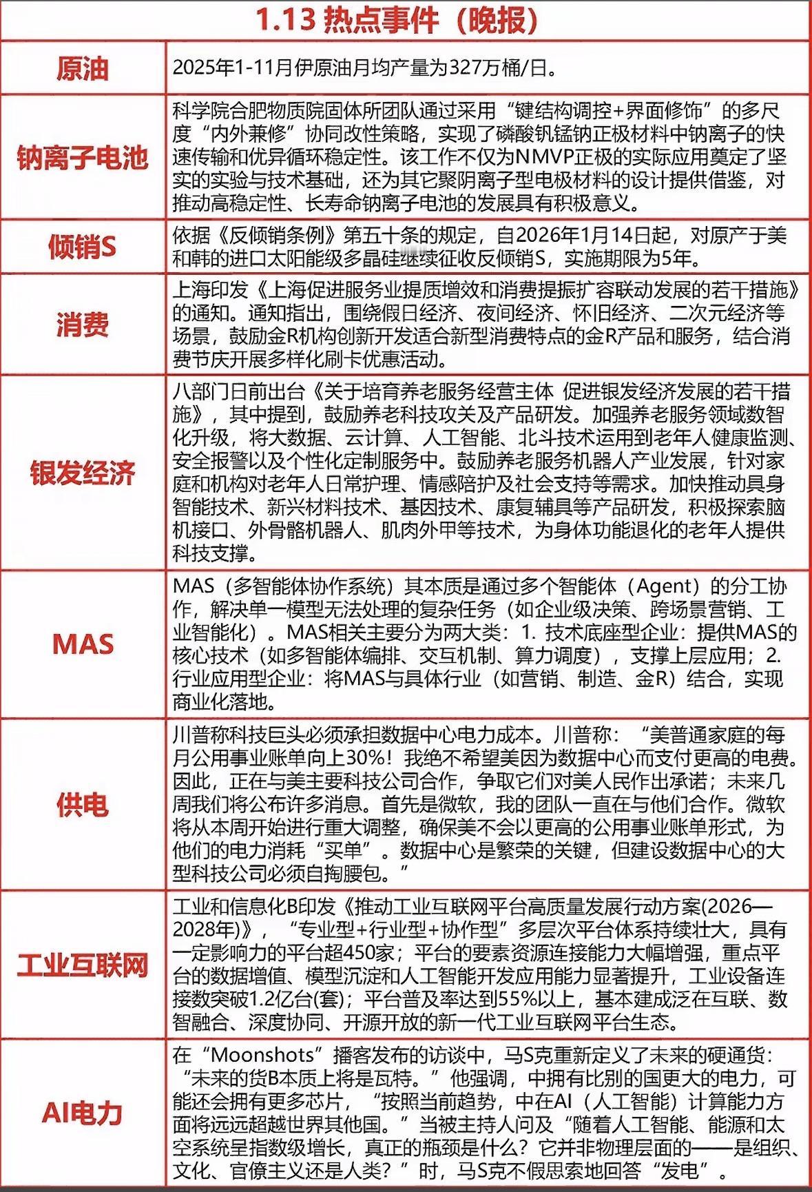 2026年1月13日晚间科技热点事件汇总 钠离子电池技术突破,银发经济推动养老科技,工业互联网平台升级,马斯克称电力是未来硬通货,多智能体协作系统商业化加速。