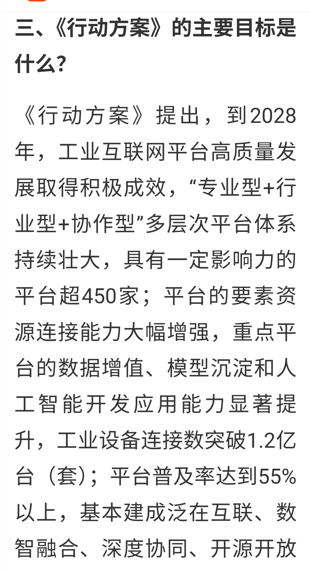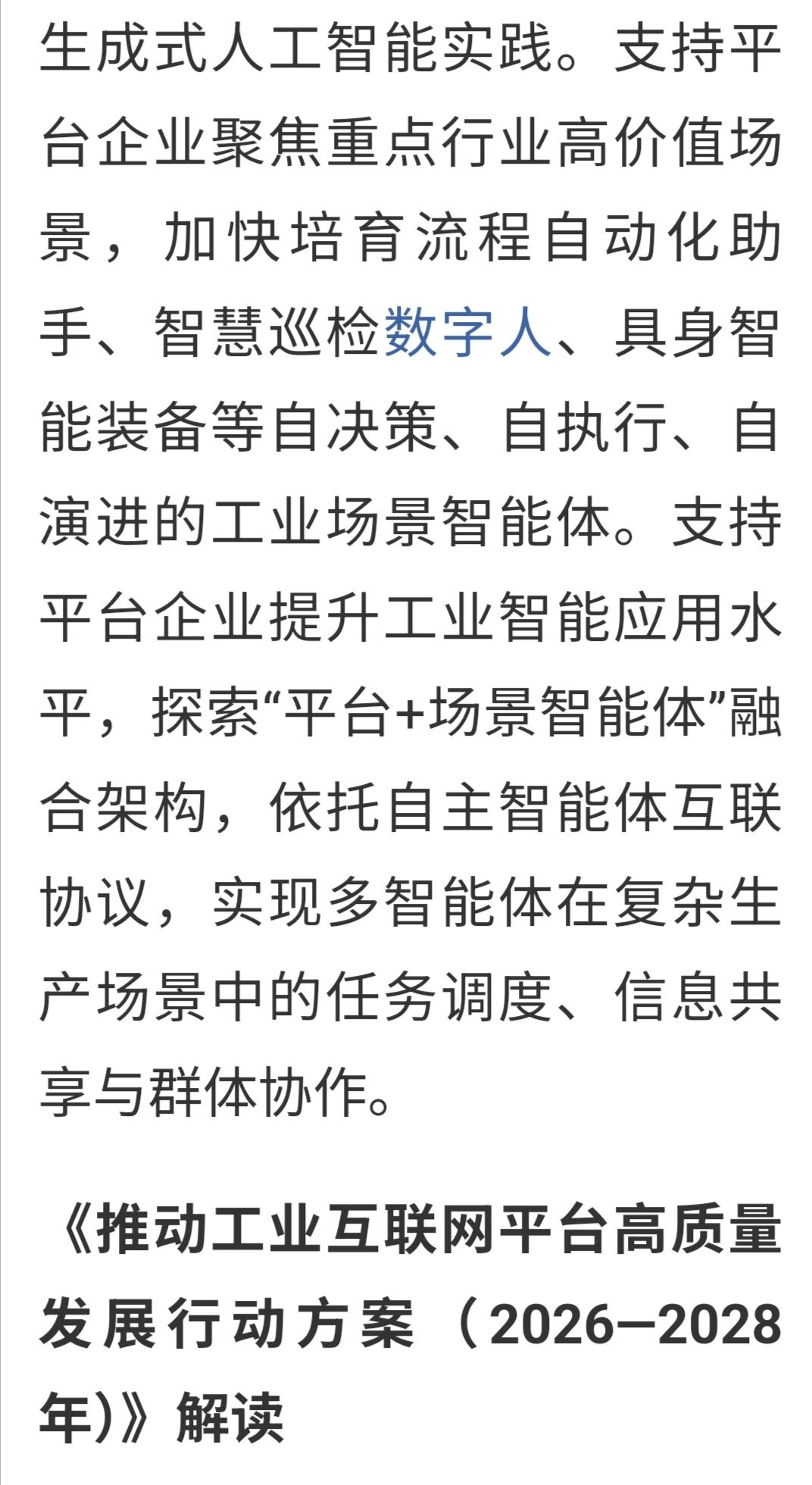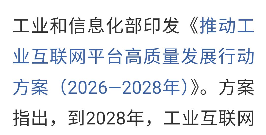 人工智能既AI应用方向,盘后再出利好,明天继续上马快奔。 今天AI应用也跟随着航天分歧了,这是连续三天暴涨之后,首次出现明显分歧。很多人都开始质疑了,就这样三天就结束了吗? 盘后,工业和信息化部出台了2026到2028年行动方案,提出,到2028年,工业互联网平台高质量发展取得积极成效,“专业型+行业型+协作型”多层次平台体系持续壮大,培育具有一定影响力的平台超450家;平台的要素资源连接能力大幅增强,重点平台的数据增值、模型沉淀和人工智能开发应用能力显著提升,工业设备连接数突破1.2亿台(套);平台普及率达到55%以上,基本建成泛在互联、数智融合、深度协同、开源开放的新一代工业互联网平台生态。 看到这样的政策支持,突然又想起了商业航天刚刚起步之后,也是有政策利好不断加持,所以才一步步走出了持续一个多月的主升浪。 相信这次的AI应用端也能继续扛起2026年前两个月的大旗,继续带领散户朋友们再吃一波大肉,让大家都美美的过个肥年,继续为实体经济发展添砖加瓦。