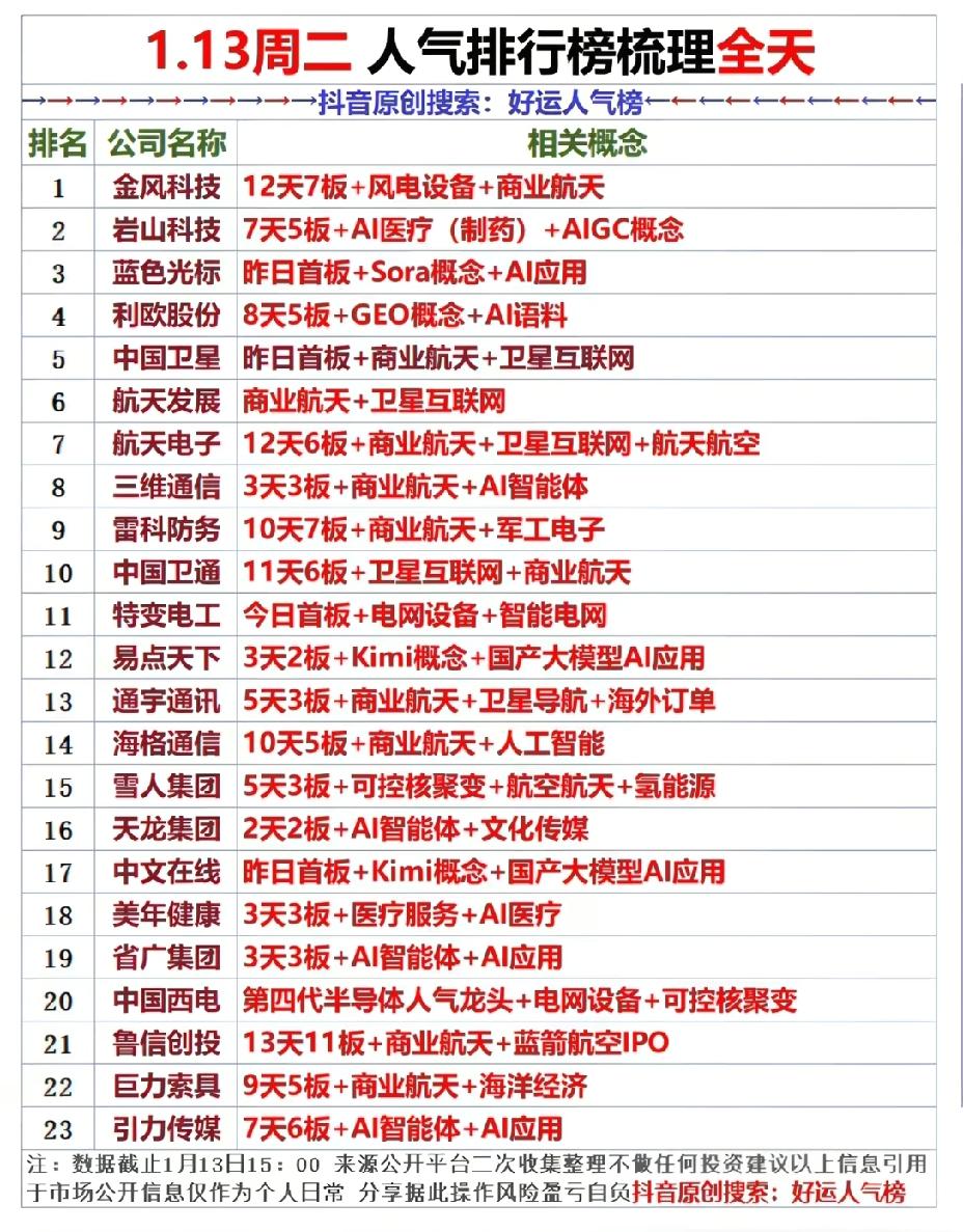 1月13日,周二A股人气排行榜!!! 金风科技今日主力资金大幅流出,人气颇高;岩山科技,7天5板,脑机接口龙头,后市值得高看一眼;蓝色光标,AI智能体龙头概念,后市值得期待;明日A股走势如何,让我们拭目以待吧!!!
