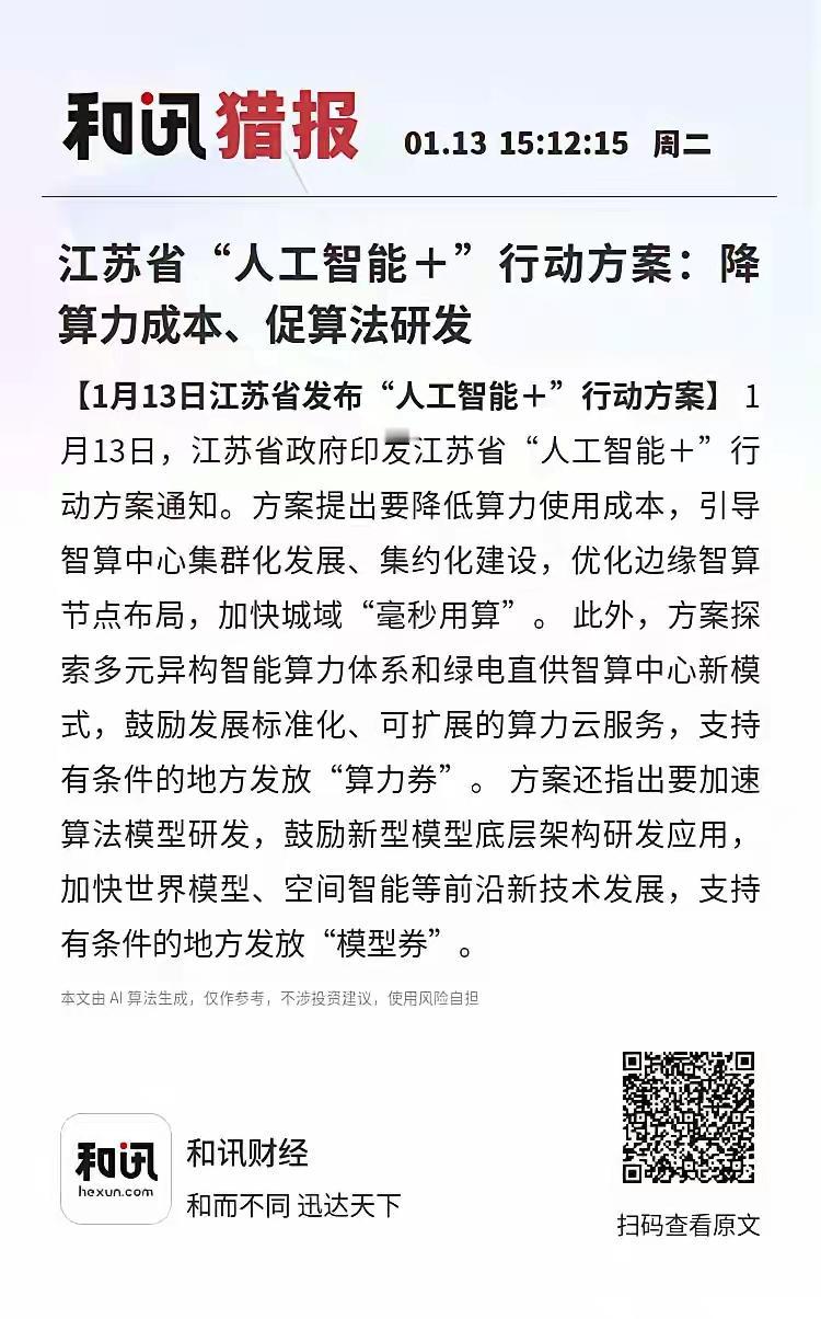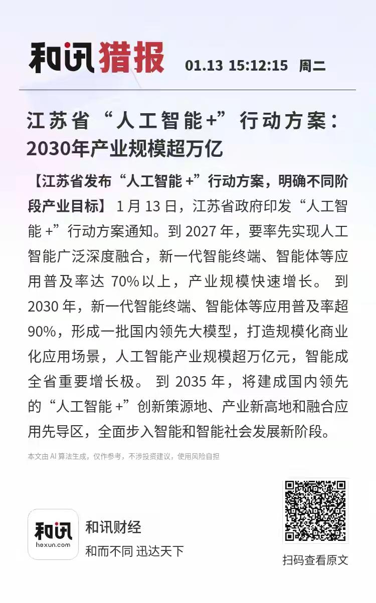 江苏省“人工智能+”行动方案:2030年产业规模超万亿,这很多省份都开始在推动人工智能加行动方案的落地!是新一代的终端以及新一代的企业升级改造!而且智能化的改造,智能化的升级将加快产业增速!人工智能更具有创新能力!让企业变得更加智能化!更高效,更具备高质量发展的前景!比较前沿的科技技术发展