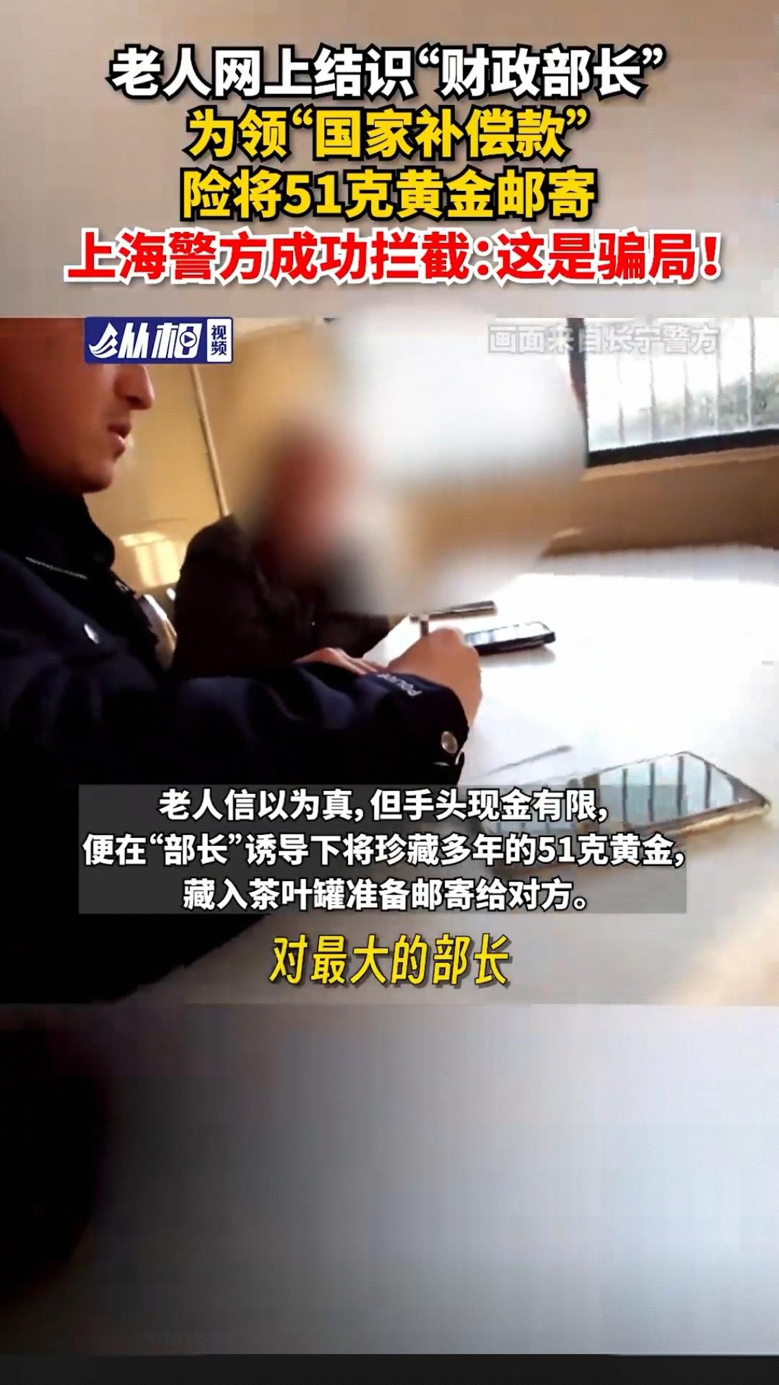51克黄金,是何阿婆压箱底的念想——有年轻时攒下的金戒指,有子女孝敬的金项链,沉甸甸的不仅是足金的分量,更是大半辈子的踏实与牵挂。可谁能想到,一个自称“财政部长”的陌生网友,竟让她心甘情愿把这份珍藏塞进茶叶盒,瞒着家人偷偷寄往千里之外。 事情要从一个普通群聊说起。晚年遭遇投资亏损的何阿婆,一直对这笔“遗憾”耿耿于怀,直到“蓝部长”主动搭话,说能为她申请“国家补偿款”,弥补所有损失。对方谈吐“官方”,承诺得斩钉截铁,还发来伪造的红头文件截图,瞬间击中了老人想要弥补损失的迫切心情。这哪里是诈骗,分明是“天上掉下来的救赎”啊! 当“部长”提出需要缴纳“登记费”“解冻费”,而何阿婆手头没有足够现金时,对方“贴心”建议:“可以用黄金抵押,补偿款到账后双倍返还。” 被希望冲昏头脑的老人,翻出了所有黄金首饰,小心翼翼包进茶叶盒,生怕被子女发现。她不知道,这看似“通融”的建议,正是骗子收割的最后一步——上海警方早已通过反诈预警系统盯上了这笔异常的快递,在包裹即将装车发运的关键时刻,民警疾驰分拣中心,成功截下了这个藏着老人半生积蓄的包裹。 其实这类骗局的套路并不新鲜,却总能精准捕获老年人的心。骗子吃透了他们的两大软肋:一是对“国家工作人员”的天然信任,二是面对损失时的“沉没成本心理”——就像首都网警剖析的那样,一旦接受了“能获补偿”的小期待,就会一步步接受更大的要求,只为避免之前的期待落空。更让人揪心的是,上海警方近年已拦截多起类似案件:薛阿婆为领理财退费寄340克黄金,蔡先生为赚翻倍收益两度寄金,都是被“高回报”“能挽回损失”的话术洗脑。 何阿婆的幸运,在于警方的快速响应,但还有多少老人正在被类似的“部长”“专员”围猎?他们或许不懂AI换脸,不会甄别虚假App,却怀揣着对生活的朴素期待。当骗子用温情关怀织网,用权威身份背书,这些缺乏数字时代防备力的老人,很容易沦为待宰的羔羊。 此刻最该反思的,何止是老年人的防骗意识?子女是否忽略了对父母的情感陪伴与反诈科普?社区的反诈宣传是否真正走进了老年群体?欢迎在评论区聊聊你身边的反诈故事,也转给家里的长辈——多一次提醒,就少一次悲剧。愿每一份晚年的积蓄,都能安稳守护岁月静好,而非落入骗子的圈套。